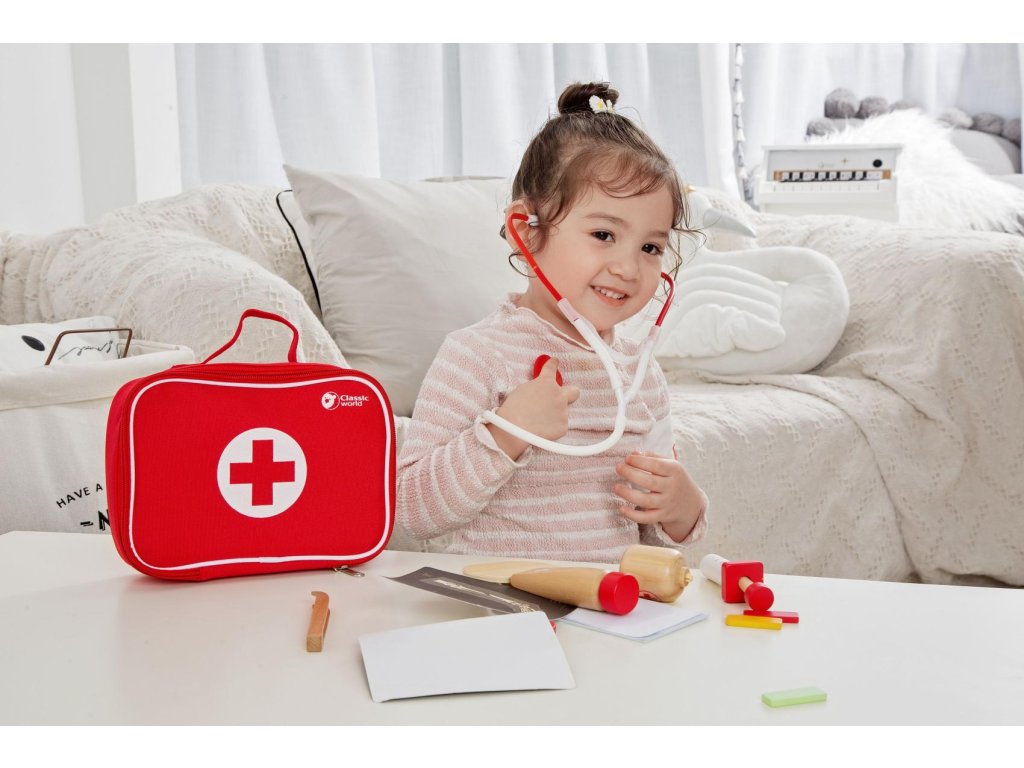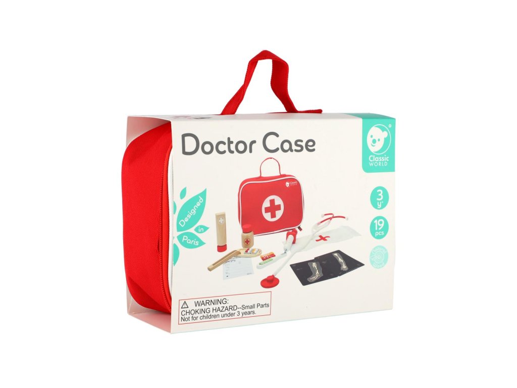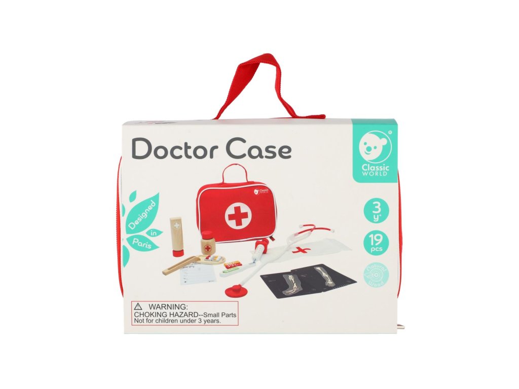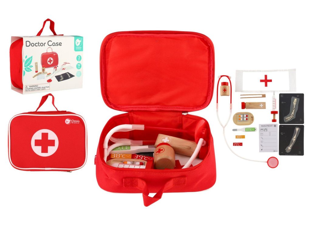 Vše, co potřebuje doktor najedete v tomto setu. Stačí si vzít stetoskop (plastový) a můžete začít léčit. V sadě je spousta dřevěných doplňků, aby hra byla zajímavější a dokážete tak vyléčit každou bolístku. Sada obsahuje 19 ks.Rozměry balení 22 x 17 x 8 cm.