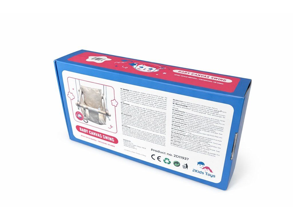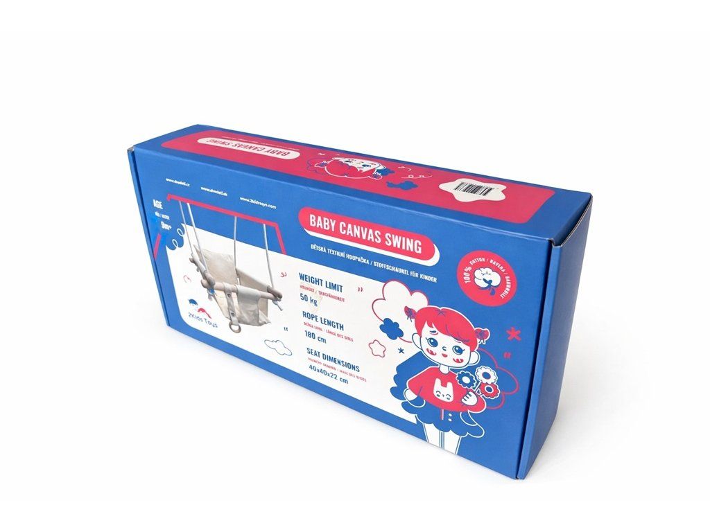 Dětská textilní houpačka z 100% bavlny a pevného dřeva, s 2 karabinami pro zavěšení a výškově nastavitelnými lany.Nezbytný pomocník pro nejmenší objevitele venkovní zábavy na dětském hřišti. Hlavní vlastnosti: nosnost 50 kgvýškově nastavitelné lano (max. 180 cm)konstrukce z pevného dřeva o rozměrech 40x2,8 cmDoplňkové parametry