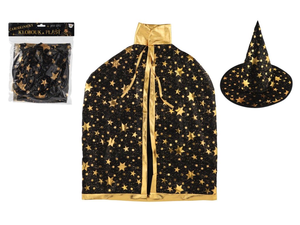Klobouk čarodějnický + plášť pro děti průměr 38cm černo-zlatý v sáčku karneval