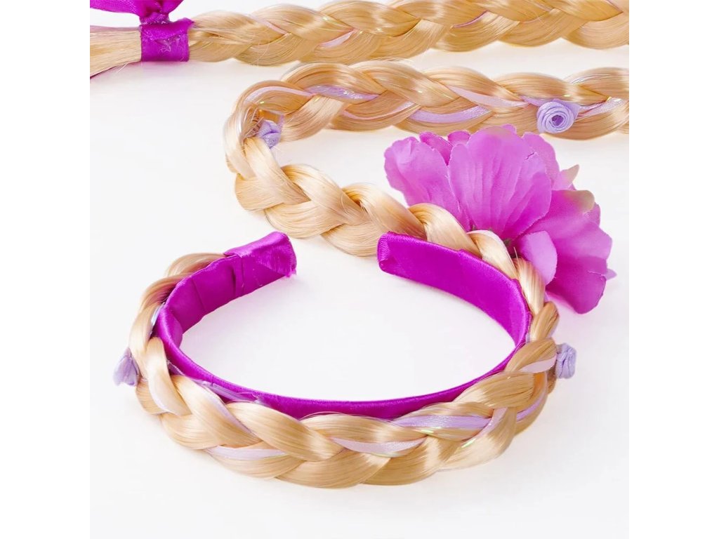 Proměňte se během okamžiku v kouzelnou princeznu s touto čelenkou s dlouhým copánkem.Čelenka je laděná do fialových odstínů a zdobí ji výrazná květina, která dodává celému doplňku pohádkový vzhled. Dlouhý blonďatý cop je spletený do elegantního účesu a zdobený drobnými třpytivými detaily i fialovou mašlí na konci.