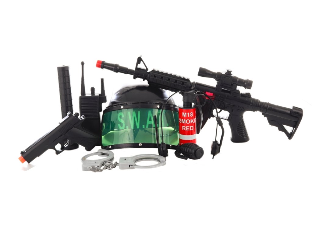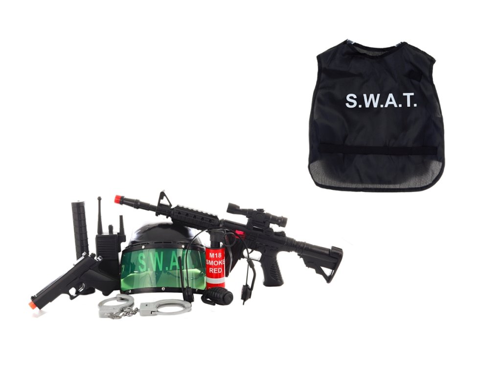 Policejní sada obsahuje helmu, vestu, samopal, vysílačku, pistoli, obušek, pouta, sluchátka a granát. Materiál plast. Baleno v plastovém průhledném obalu. Rozměry balení cca 52x34x12 cm. Velikost vesty 34x37 cm. Věk 3+Doplňkové parametry