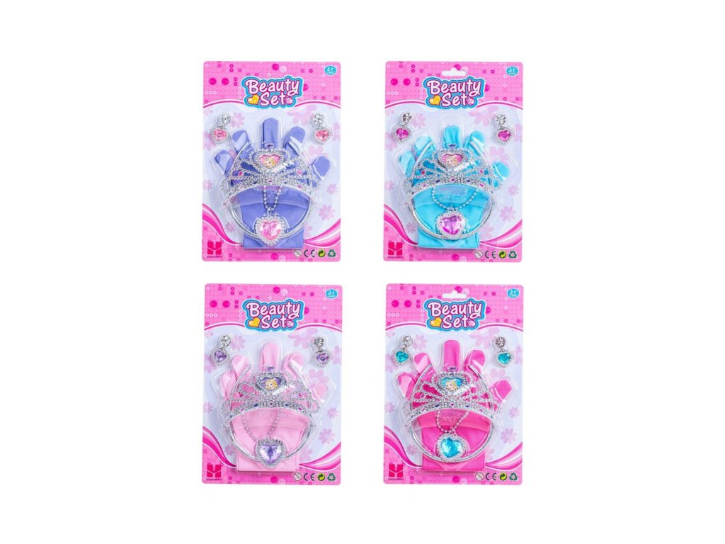 Šperky a rukavičky sada doplňků. Korunka 12,5 cm. Obsah balení - rukavičky, korunka, čelenka, náhrdelník, 2 náušnice. 4 varianty - modrá, fialová, růžová, červená.Doplňkové parametry