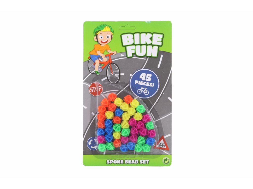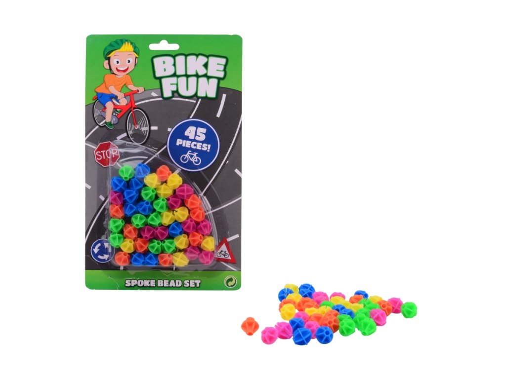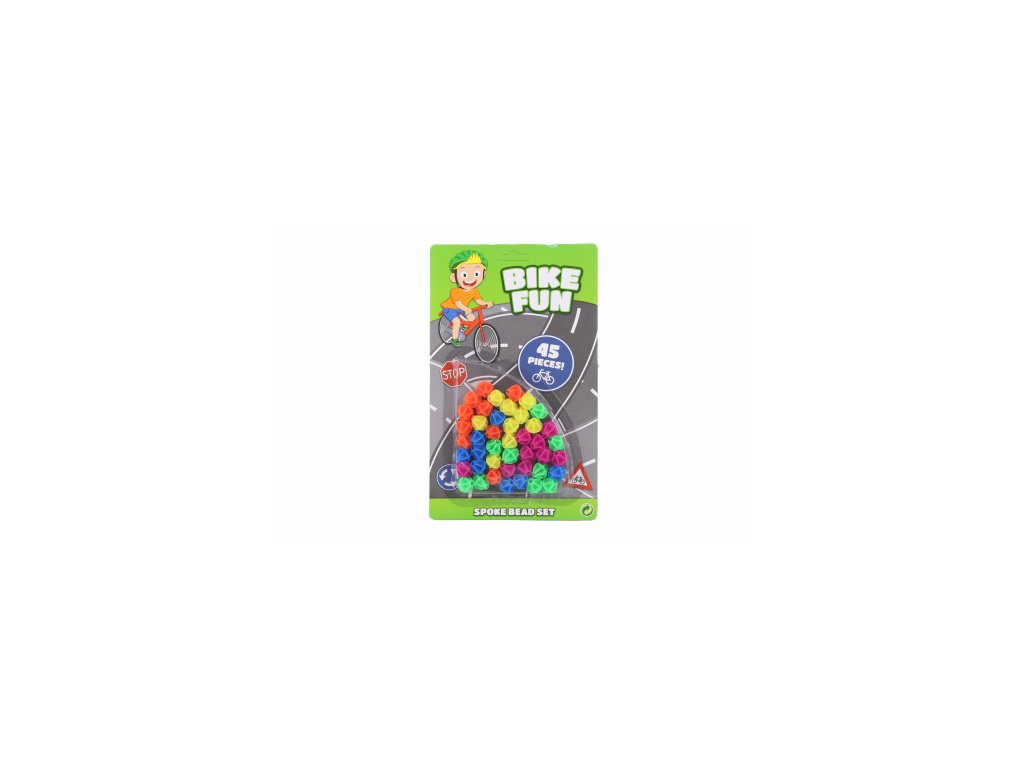 Barevné ozdobné korálky na kolo. Materiál plast. Balení obsahuje 45 korálků. Po instalaci se hýbou nahoru a dolů podle pohybu kola. Výrobek není hračkaDoplňkové parametry