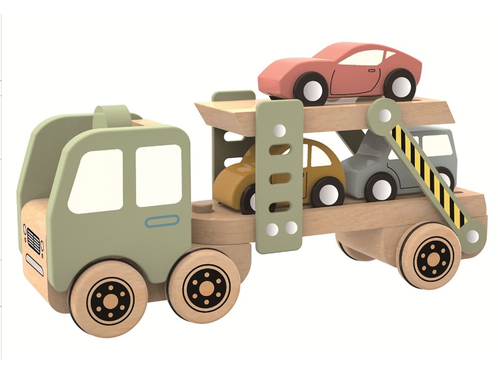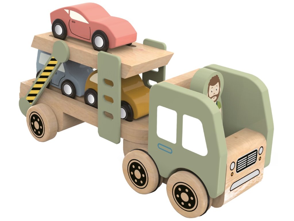 Naložte autíčka, posaďte řidiče za volant a vydejte se na cestu za dobrodružstvím! Dřevěný přepravník se třemi autíčky a řidičem potěší všechny malé milovníky aut. Autíčka i figurku řidiče lze jednoduše vyndat a znovu naložit. Hračka podporuje rozvoj motoriky, fantazie a představivosti dětí. Kombinace přírodních tónů s jemnými odstíny barev spolu s kvalitním provedením dělají z této hračky pěkný doplněk každého pokojíčku nebo herny.