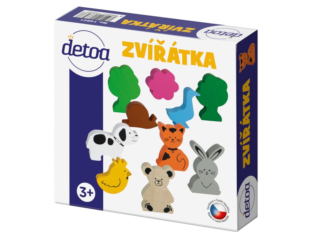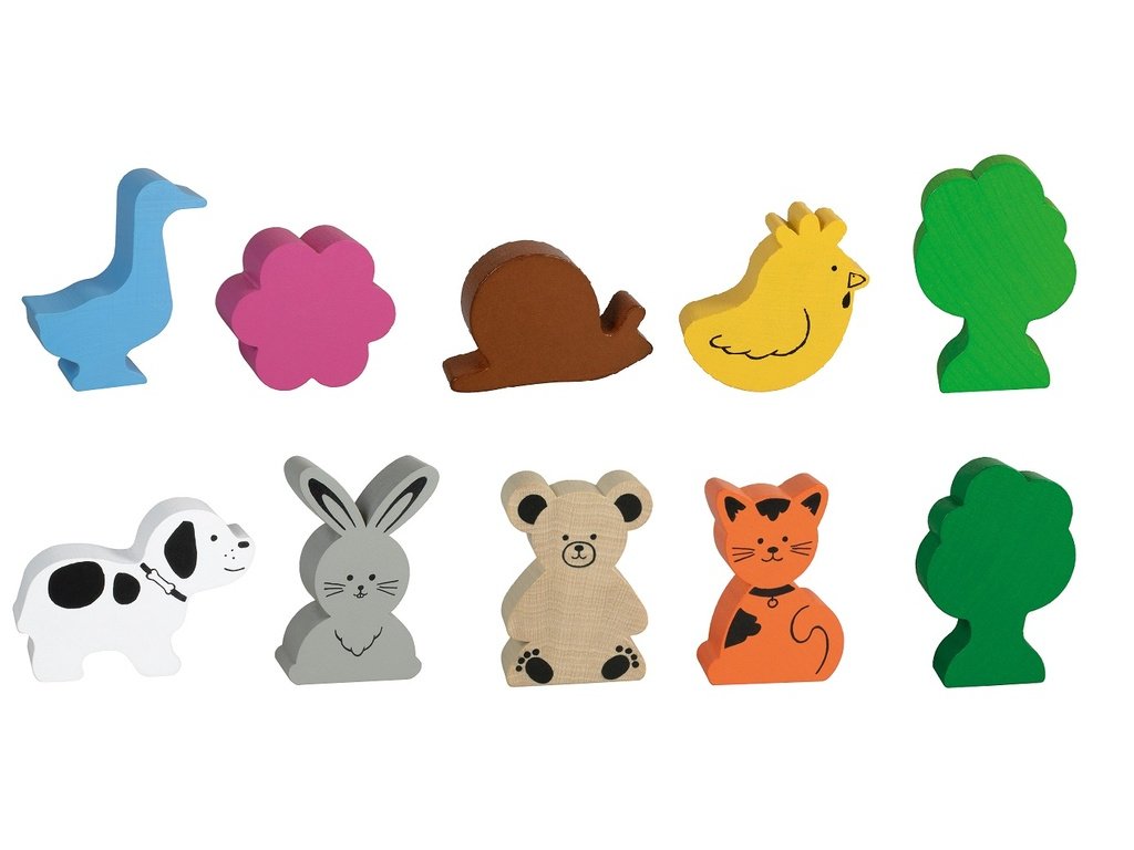 Kočka, medvídek, zajíček, kuřátko, pejsek, husa, šneček, kytička a 2 stromySeznamte se s roztomilou sadou dřevěných zvířátek, která přináší zábavu a rozvíjí fantazii