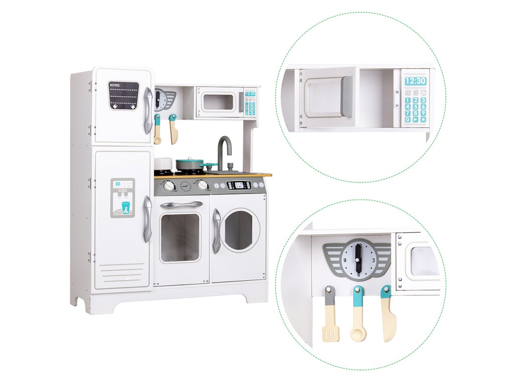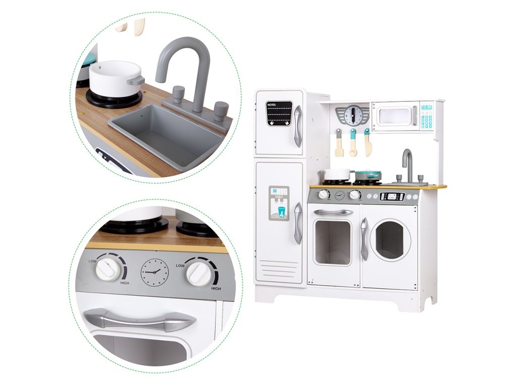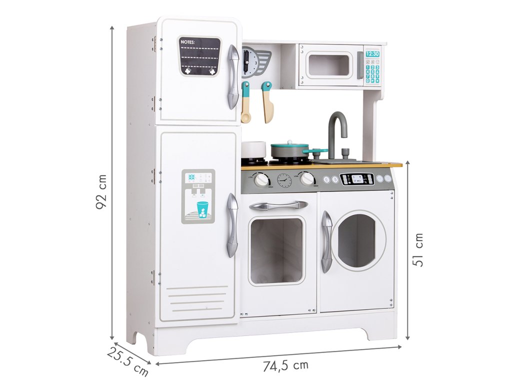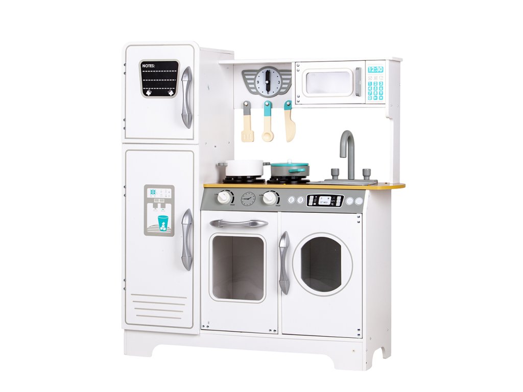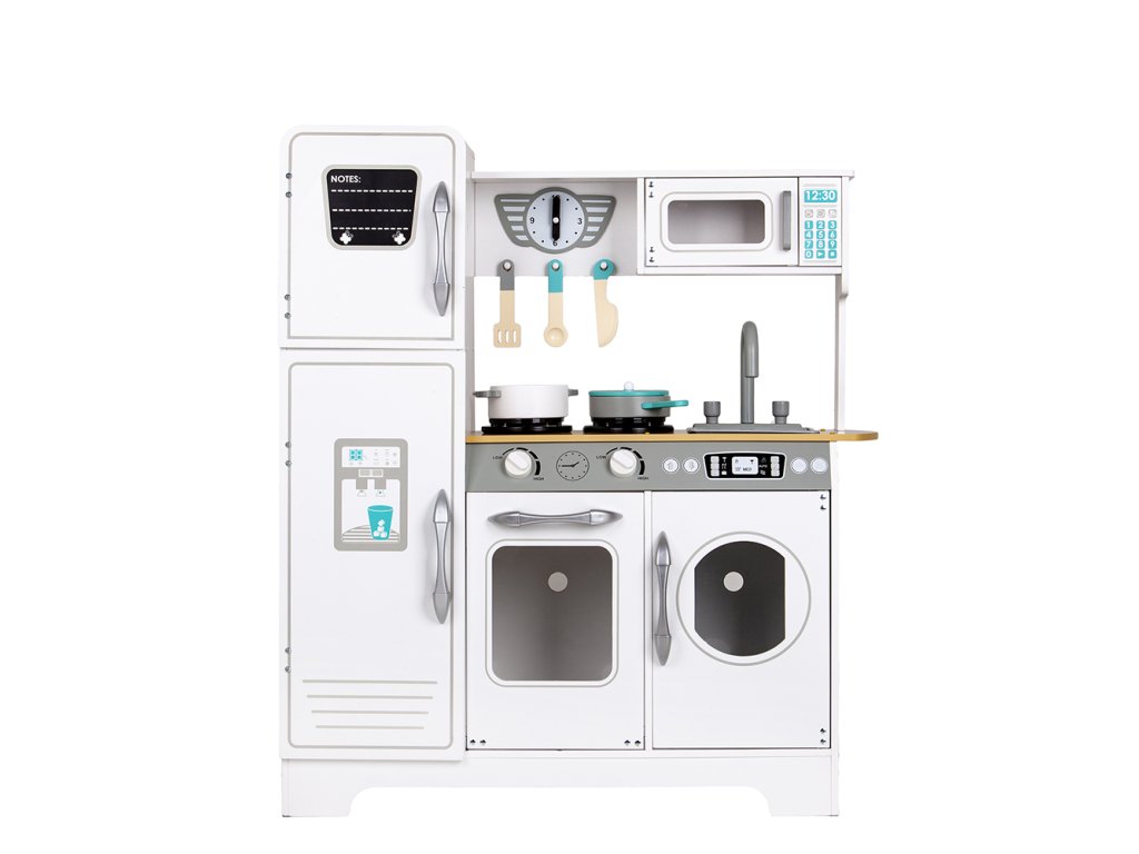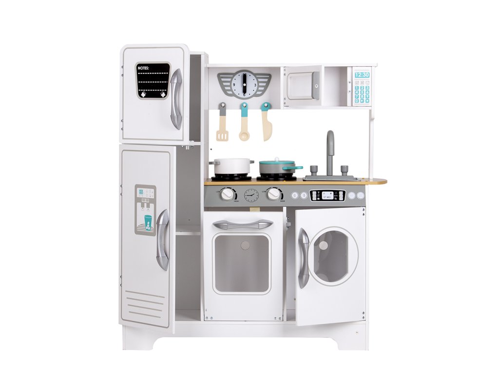 Kuchyňka nabízí zábavu nejen při vaření a přípravě jídel, ale také při dalších domácích činnostech. Pračka umístěná vedle trouby umožní hru na praní prádla. To je skvělý krok, jak učit dítě samostatnosti a zodpovědnosti v každodenních povinnostech.
