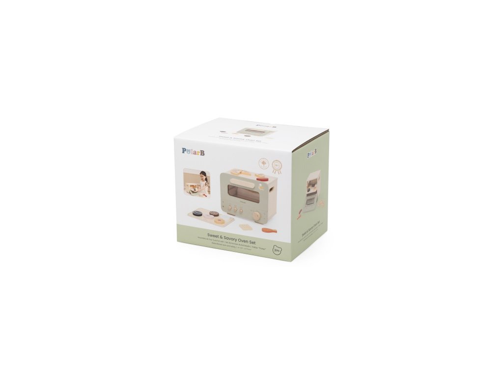 Dřevěná trouba s potravinami. Balení obsahuje troubu o rozměrech 25x18,6x20,7 cm, oplatky, pizzu, párek a kuřecí paličku. Baleno v krabici. Rozměry balení 26x22x20 cm. Věk 3+Doplňkové parametry