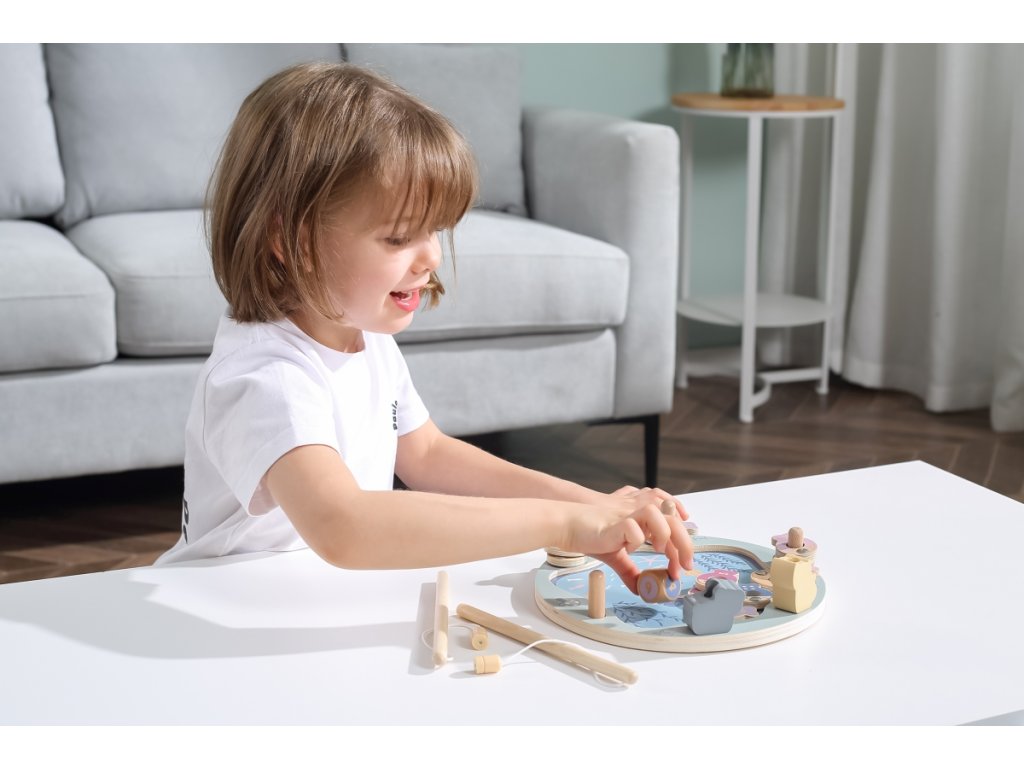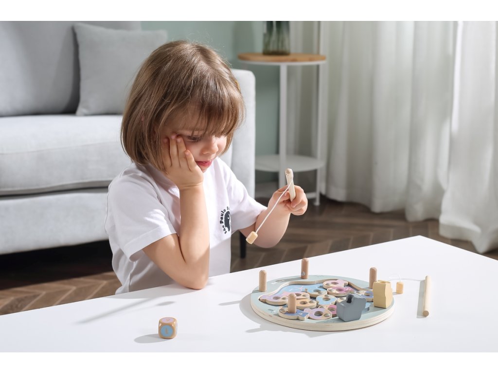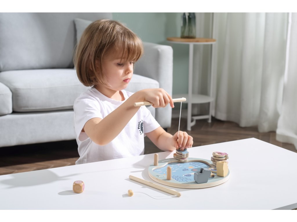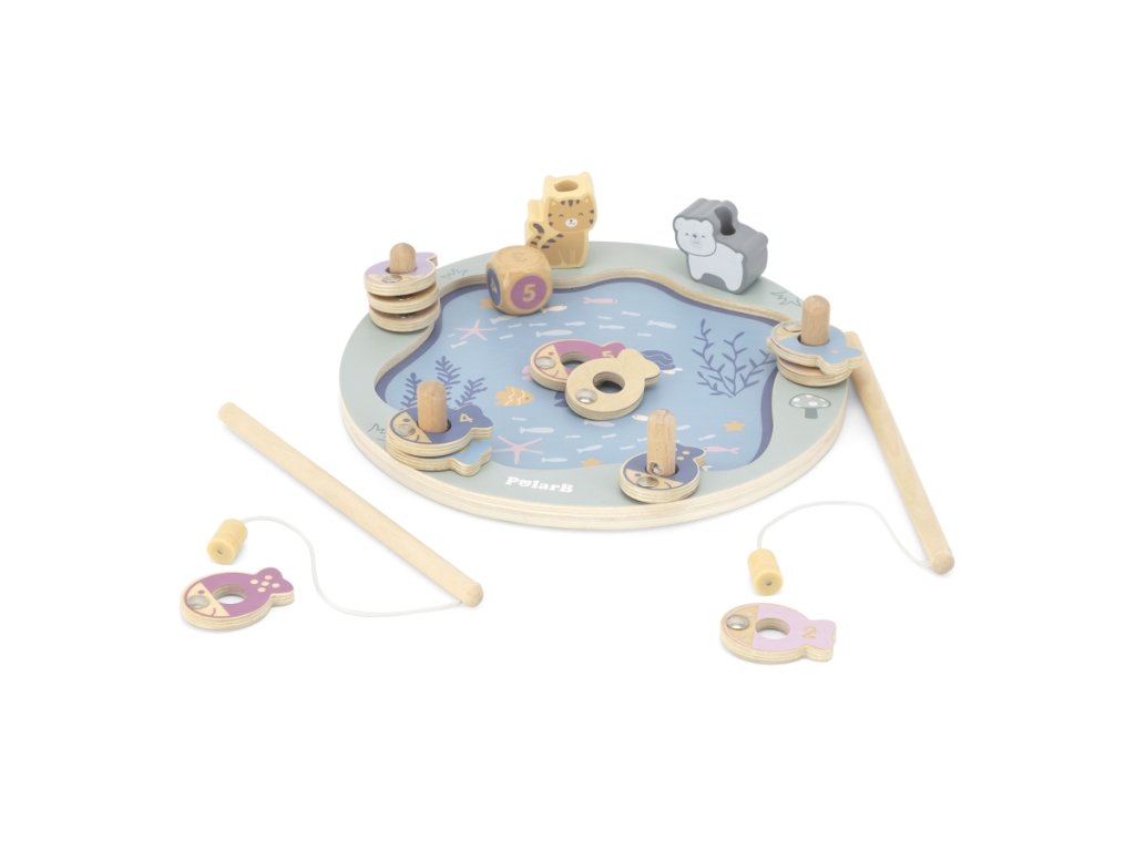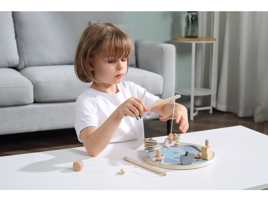 Tato magnetická rybářská hra se skládá z rybníka, 12 ryb, kostky a dvou rybářských prutů. Pomocí magnetických tyčí chyťte ryby a položte je na dřevěný kus. Ryby lze rozlišit buď podle barvy, nebo podle čísla na zadní straně, takže je to skvělý nástroj pro představení pojmů barva a číslo. Pomáhá pěstovat koordinaci ruka-oko a trpělivost a zvyšuje sebevědomí. Rozmer hrací desky cca 22,5 x 21,5 cm. Rozměr balení cca 23,5 x 23,5 x 6 cm. Věk 18m+Doplňkové parametry