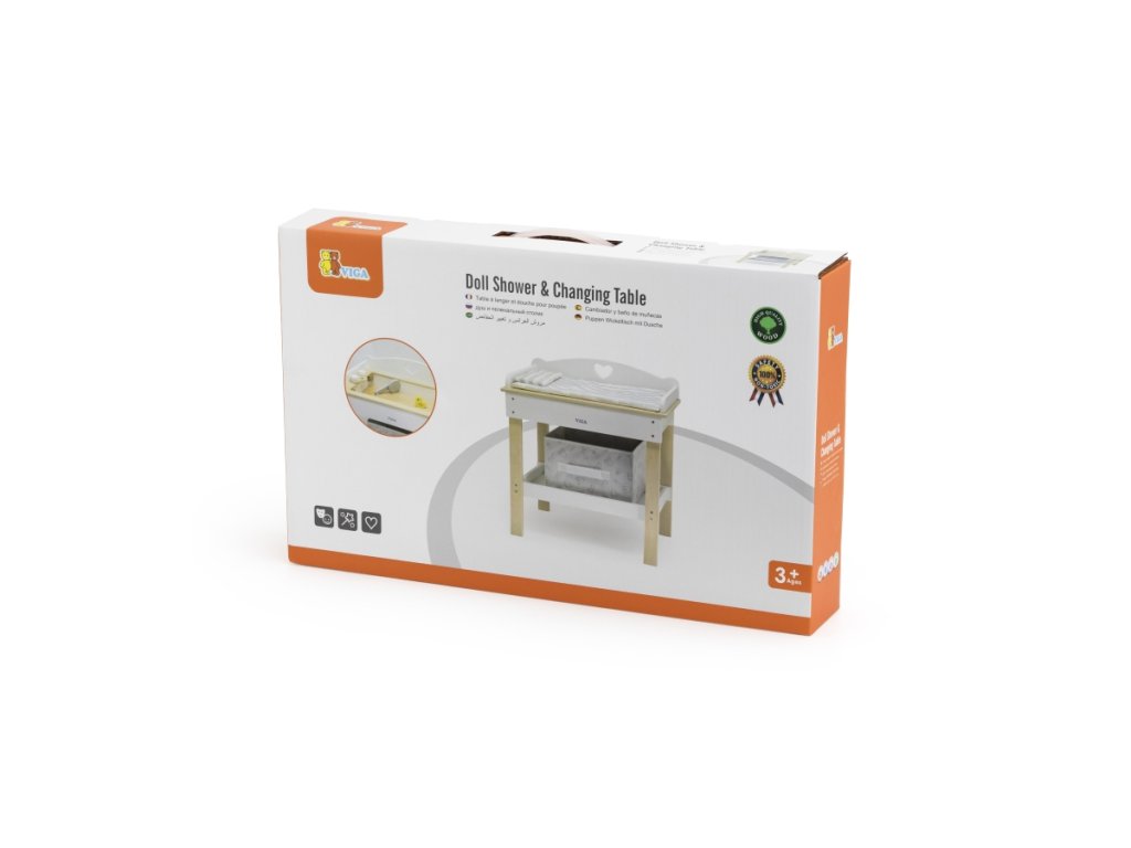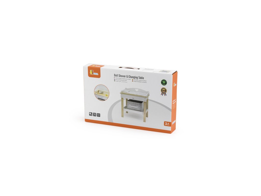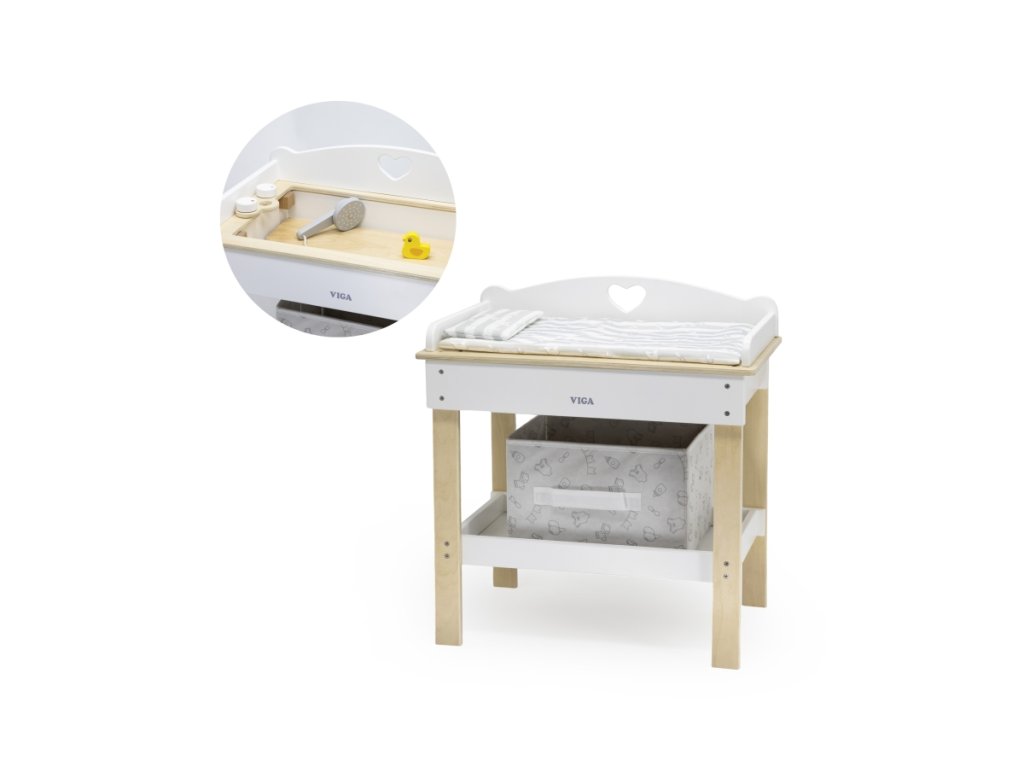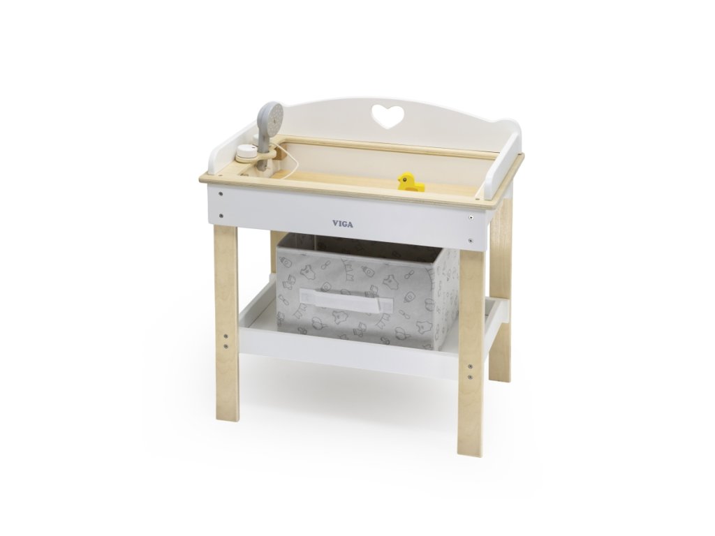 Dřevěný přebalovací pult s vaničkou pro miminko. Balení obsahuje pultík, vaničku, sprchu, kačenku a látkový košík na drobnosti. Rozměry balení cca 51x32x8,5 cm. Rozměry pultíku 50x30x54,5 cm. Věk 3+Doplňkové parametry