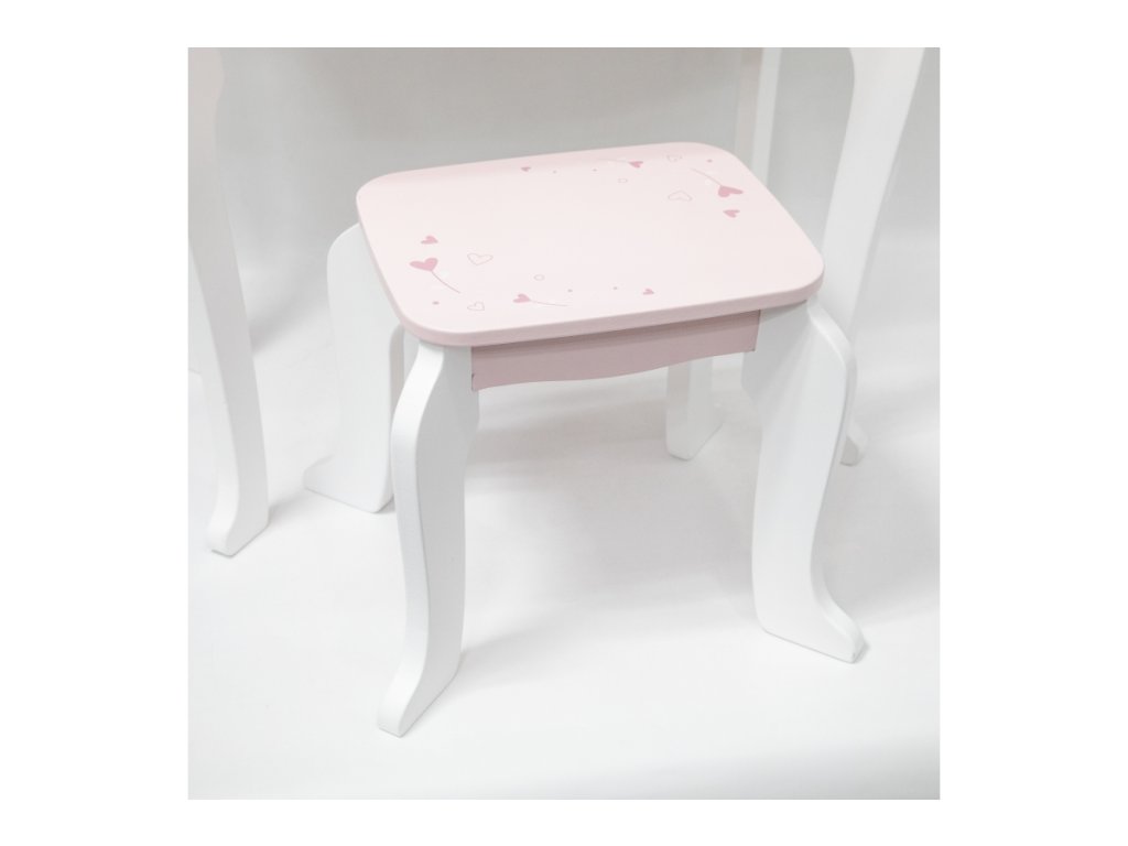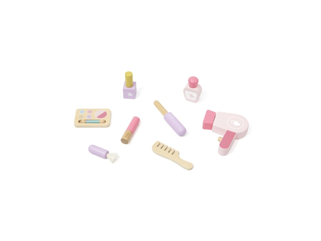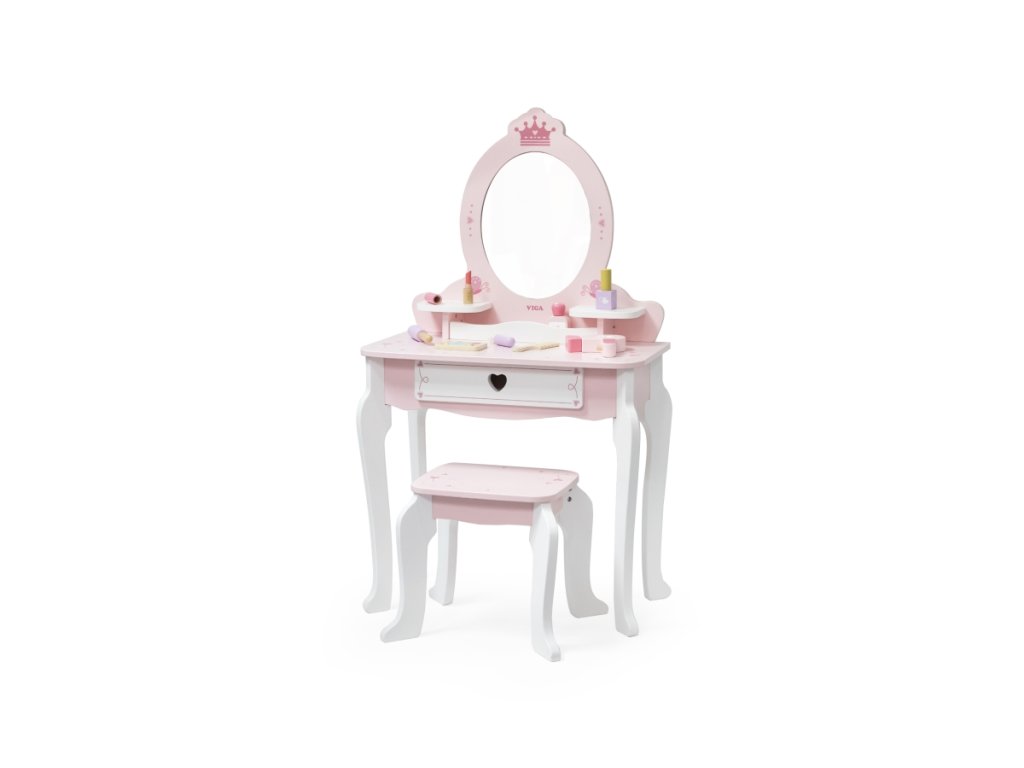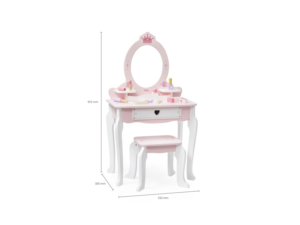 Dřevěný toaletní stolek v růžové princeznovské barvě. Součástí drobné doplňky jako např.fén, hřebínek nebo lak na nehty. Velikost tolku 95,5x55x30 cm. Rozměry balení 62x51x19 cm. Věk 3+Doplňkové parametry