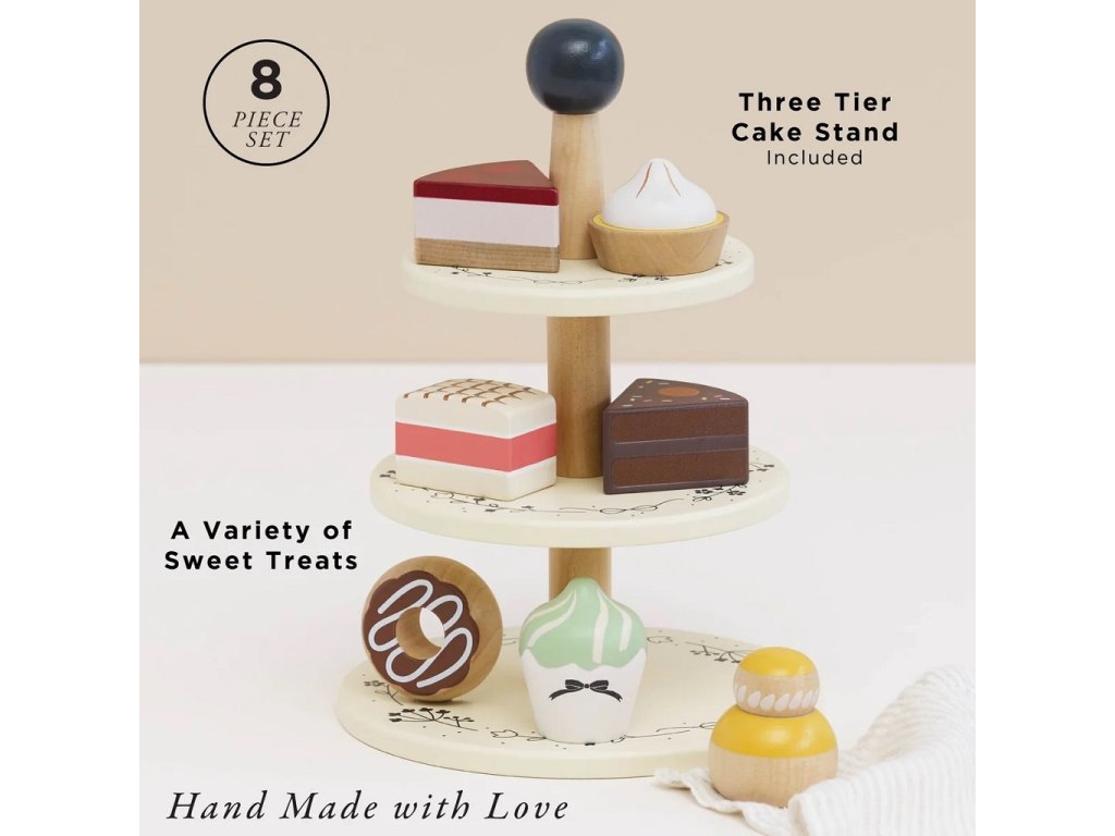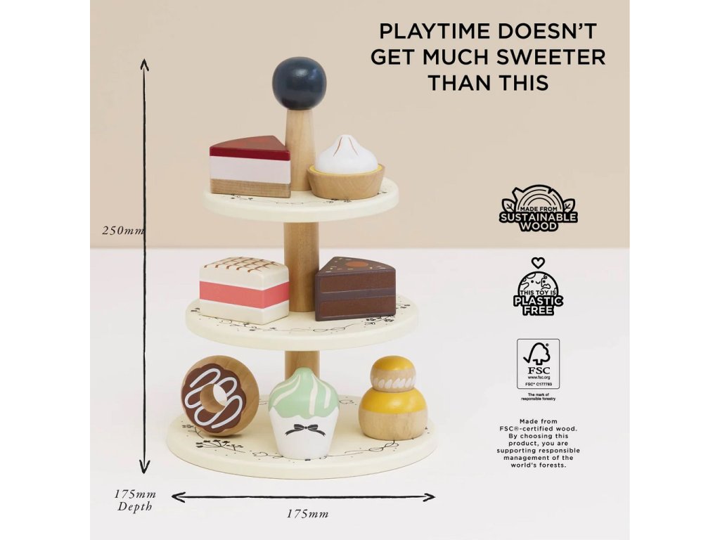 Přineste dětským hrám sladkou atmosféru a nekonečnou kreativní zábavu s tímto dokonalým doplňkem do dětské kuchyňky či herního koutku. Skvělá hračka pro malé cukráře i hospodyňky. Tento kvalitní stojan na dorty je ručně vyroben ze dřeva z udržitelných zdrojů, ekologicky lakován netoxickými vodovými barvami a plně bezpečný pro děti. Každé z tří pater je krásně zdobeno. Stojan je navržen tak, aby dokonale ladil s dalšími dřevěnými hračkami a doplňky.