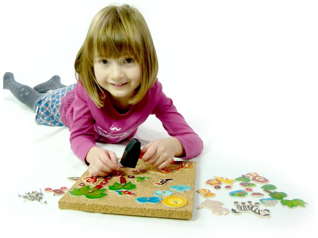 S touto zatloukací hrou se nebudete nudit. Použité barvy a tvary stimulují představivost. Tvořte rozmanité obrazy a cvičte jemnou motoriku Vašeho dítěte. Součástí sady jsou tvarové dílky z tištěné překližky, dřevěné kladívko, korková podložka a 50 ks hřebíčků s velkou půlkulatou hlavičkou.