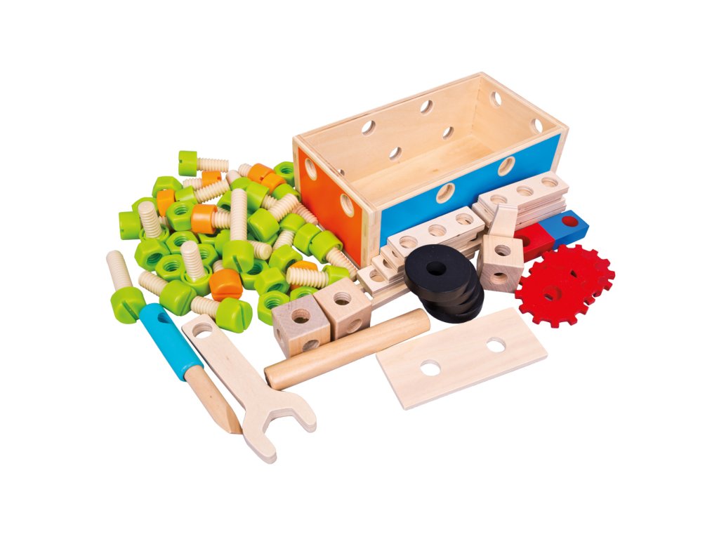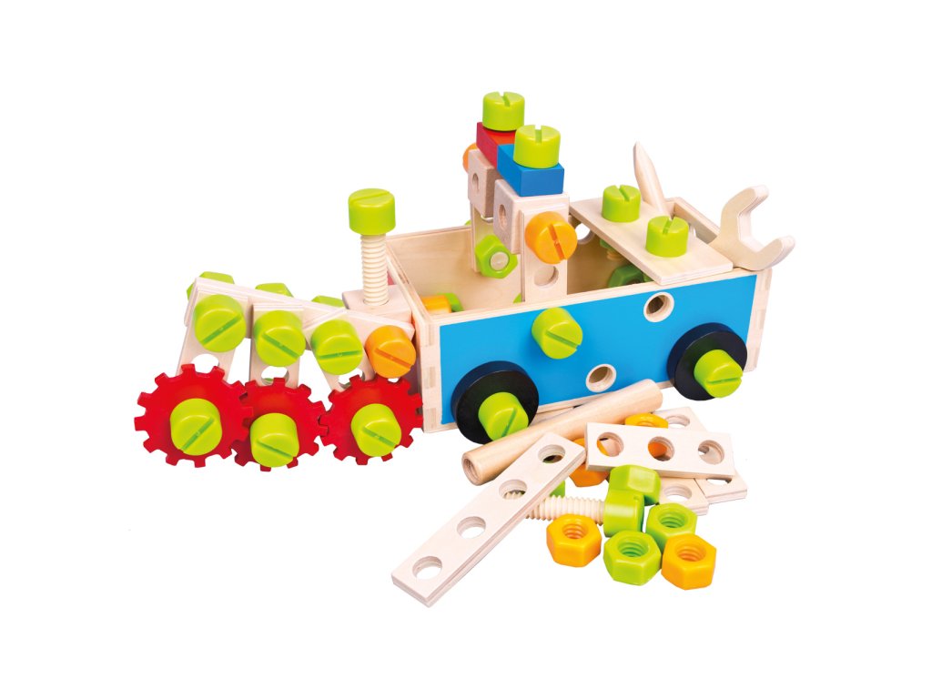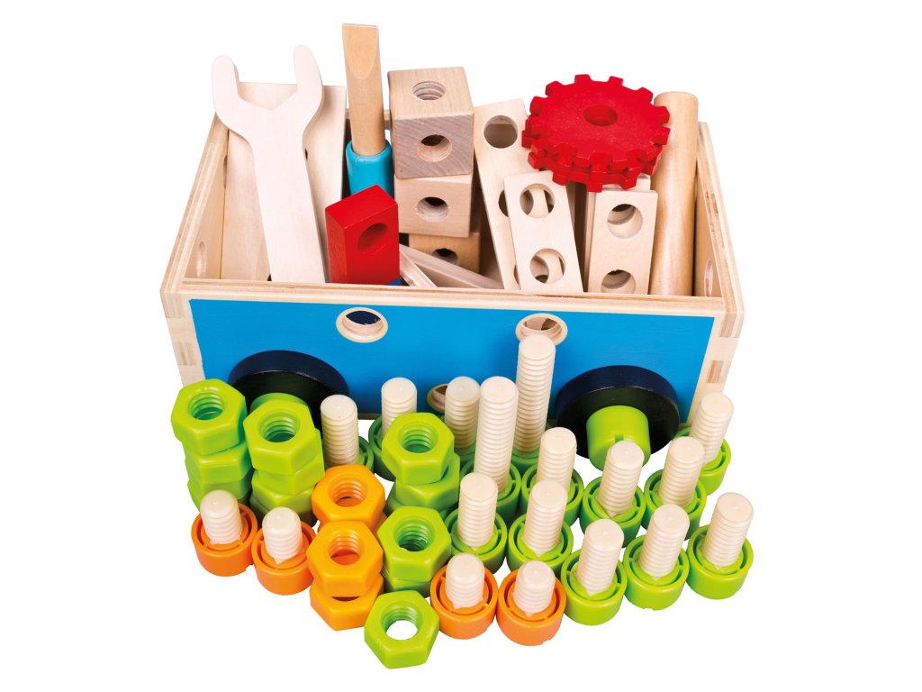 Stavebnice ideální pro všechny malé kutily a opraváře. Pomocí šroubováku, klíče, šroubků a matiček lze stavět podle předloh, nebo dle vlastní fantazie. Souprava pomáhá dětem budovat vztah k řemeslné práci a rozvíjet logiku, trpělivost a jemnou motoriku. Hračka nabízí robustní design bez ostrých hran, s jasnými výraznými barvami. Je velmi praktická, lze ji snadno uskladnit a přenášet.