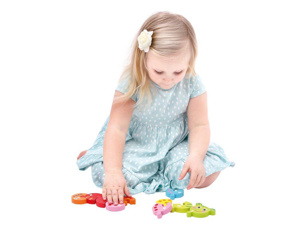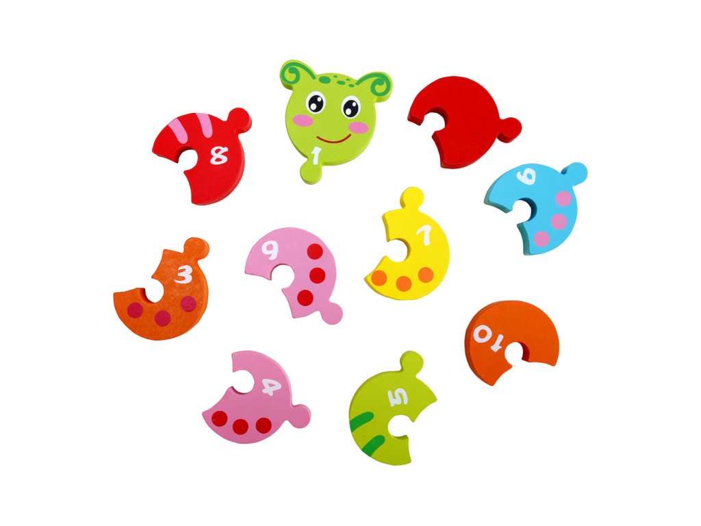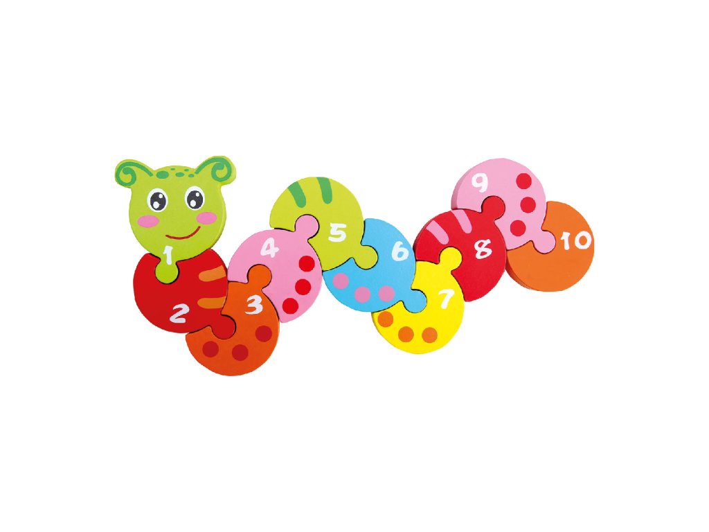 Pomocí jednoduché skládačky ve tvaru žížaly se děti mohou zábavným způsobem naučit chápat posloupnost a základní čísla. Robustní dílky jsou snadno uchopitelné a pestře zbarvené, snadno si tak získají a udrží dětskou pozornost. Vyrobeno z masivního dřeva ošetřeného nezávadnými barvami. Dodáváno v praktické, snadno přenosné tubě opatřené poutkem.