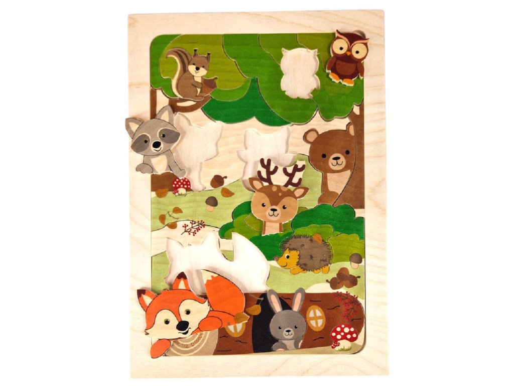 Barevně tištěné puzzle s motivy lesních zvířátek. Puzzle je vyrobeno z březového dřeva. Splňuje všechny evropské bezpečnostní normy.