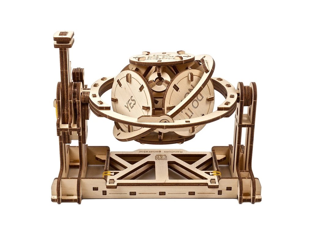 Hledáte odpovědi na své otázky? Stavebnice náhodného generátoru z překližky. Stisknutím jeho tlačítka roztočte kostku a nechte o svém konání rozhodnout náhodu, přitom objevujte základní prvek číslicové techniky a kryptografie. Kostka s odpověďmi je uložena v atraktivním kardanovém závěsu a mechanismus spoušti disponuje jednoduchým převodem, který zamezuje předvídatelnosti a podvádění. Model je certifikován nezávislou americkou iniciativou STEM.org jako vhodný doplněk výuky. Provoz hotového modelu je možno zážitkově prohloubit QR kódem s pomocí Vašeho mobilního telefonu – díky podpoře rozšířené reality s aplikací UGEARS, se lze názorně interaktivně učit o reálném uplatnění mechanismu. Zkoumejte svět mechaniky i s dalšími modely STEM. Vybaveno detailním návodem k sestavení.