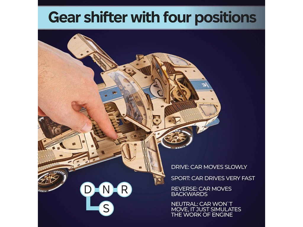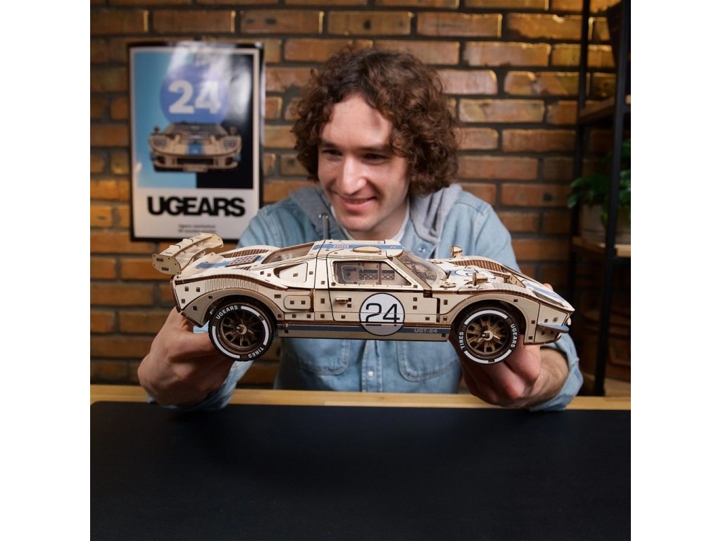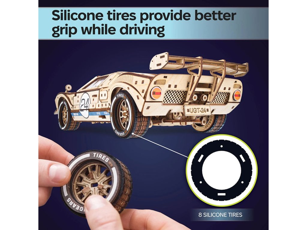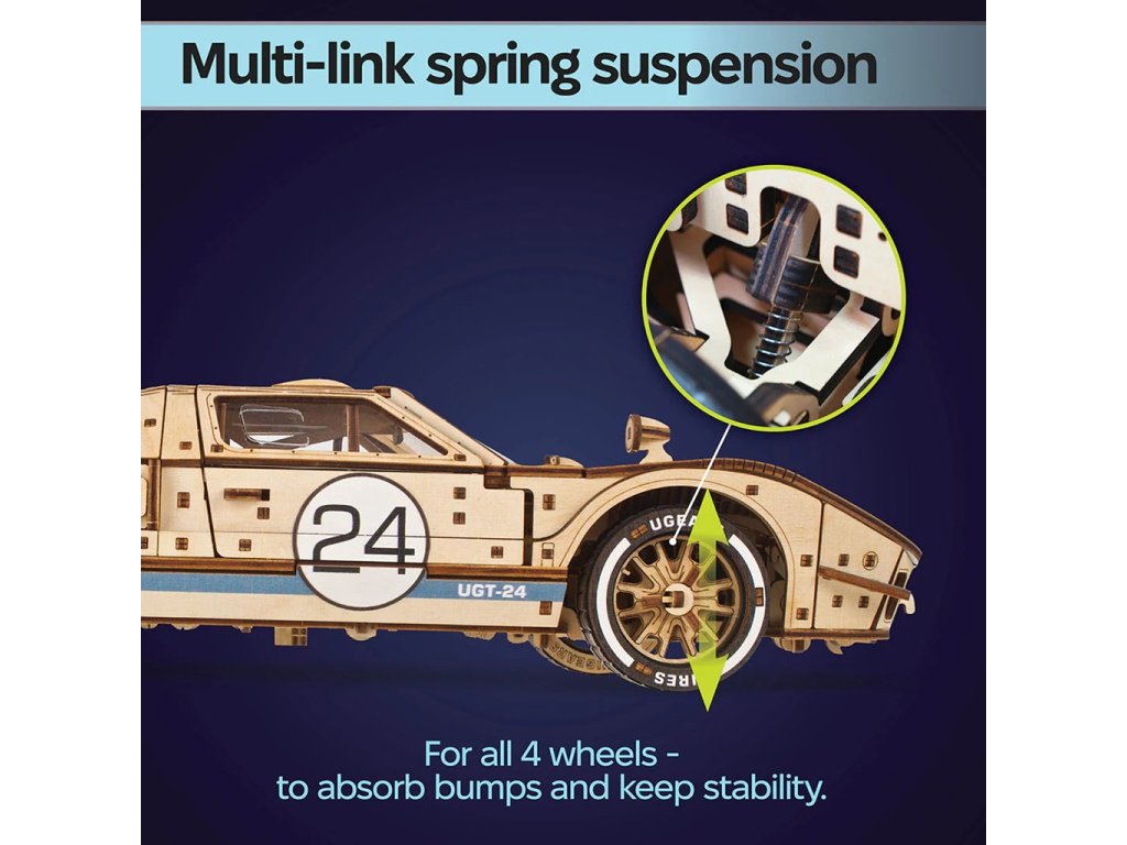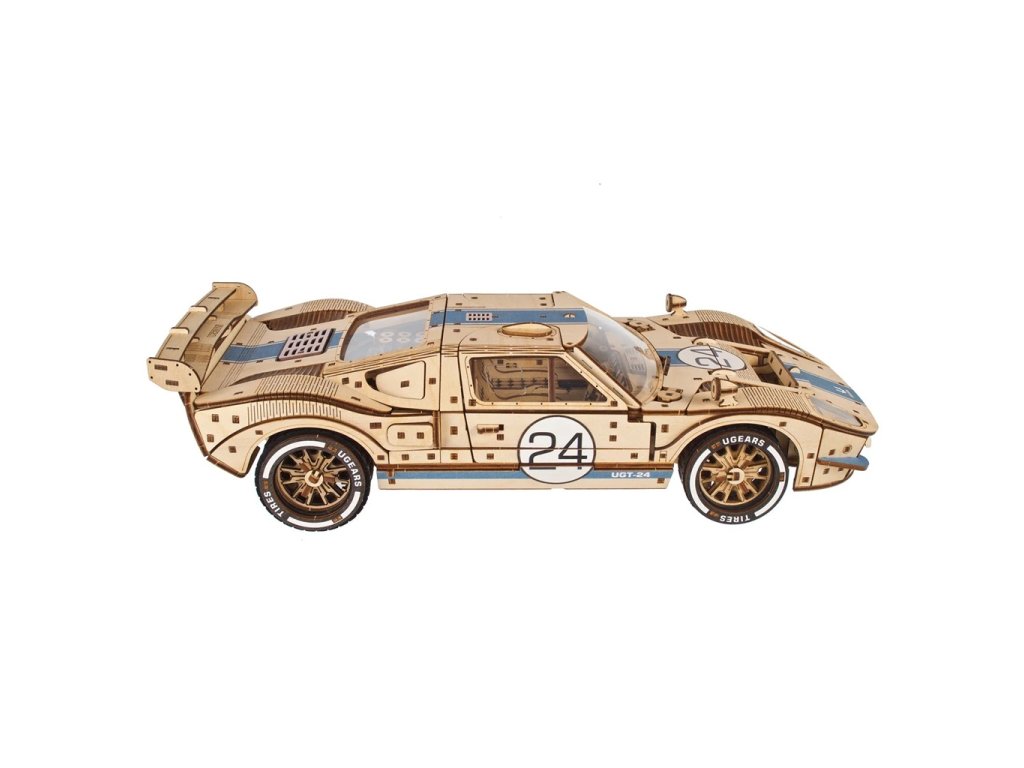 GT-24 Endurance Racer je dřevěný model v měřítku 1 : 12 inspirovaný ikonickými závodními vozy z 60. let minulého století. Toto dvoudveřové sportovní kupé potěší každého motoristického nadšence detailním zpracováním a mnoha funkčními prvky, jako jsou plné odpružení, otevírací kapota a kufr, zamykací dveře, silikonové pneumatiky pro extra přilnavost, barevné závodní pruhy a okna, motor V8 s pohyblivými písty a řadicí páka s režimy vpřed, vzad a sport pro extra zrychlení. Mezi pohyblivé části tohoto modelu patří ventilátor chladiče, ruční brzda, víčko palivové nádrže a zamykatelné dveře. Vyjměte z kufru klíč, zasuňte jej do mechanismu pod podvozkem, přepněte spínač stop/start nebo zařaďte neutrál, abyste mohli pozorovat pohybující se písty. Závodní vůz je schopen ujet 5 až 6 metrů. Skládačka je dodávána v nesloženém stavu, zabalená v krabici s podrobným návodem k sestavení v 11 jazycích. Všechny dílky jsou přesně vyřezané a lehce do sebe zapadnou bez použití lepidla či nástrojů, aby výsledek byl stabilní a odolný.