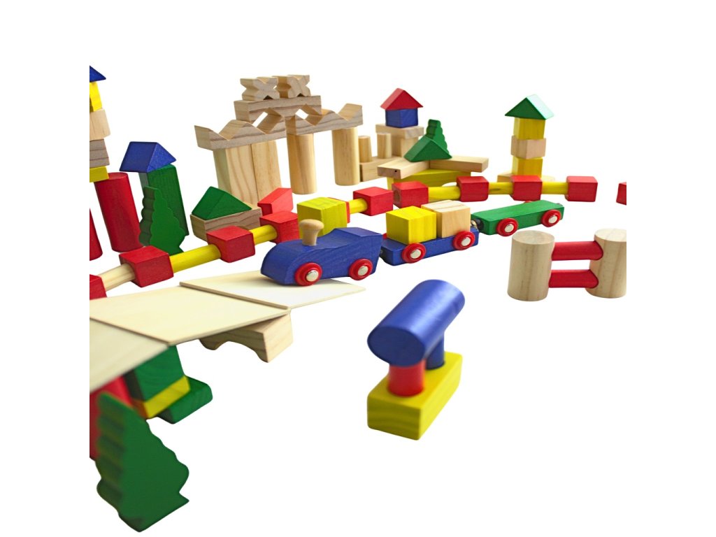 Rozsáhlá sada barevných dřevěných kostek nabízí ještě více prostoru pro fantazii, tvoření a kreativní hru. Díky 500 dílkům mohou děti stavět velká města, hrady, mosty i celé herní světy. Součástí sady jsou také tematické prvky, jako je stromeček a dřevěná mašinka, které hru obohacují a dodávají jí nový rozměr.