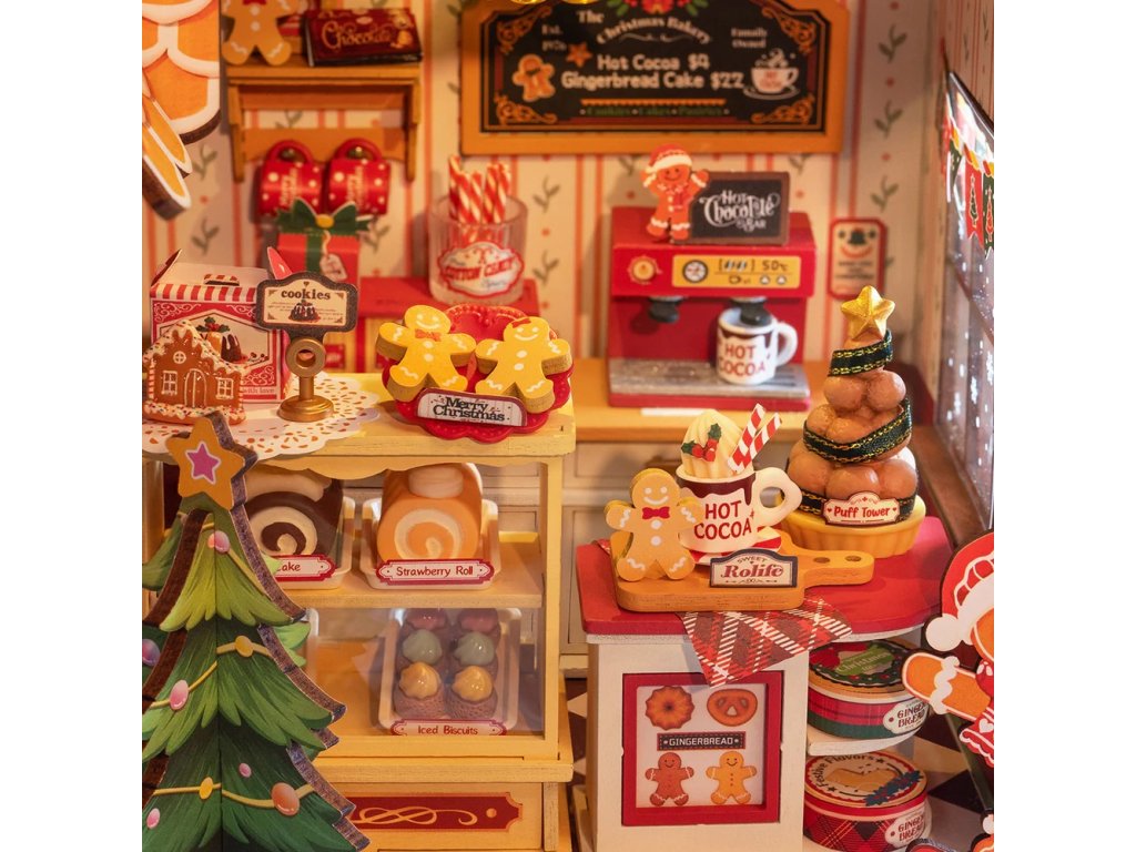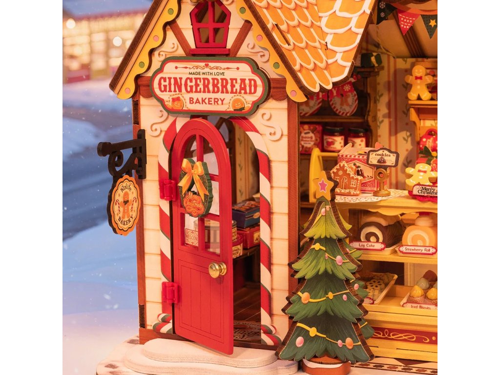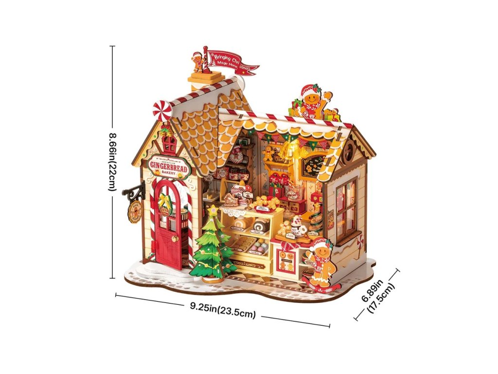 Postavte si svou vlastní vánoční perníkovou chaloupku s touto 3D skládačkou od Rolife! Tento krásný domeček je plný sladkostí a dobrot, které si můžete vystavit doma. Osvětlená chaloupka je plná různých koláčů, sušenek, čokolád, džemů a směsí na horké kakao. Střecha je matná, ozdobená cukrovými hůlkami, dveře jsou červené a před domečkem stojí vánoční stromeček. U komína je vlajka s nápisem „Přinášíme domů vánoční kouzlo“.