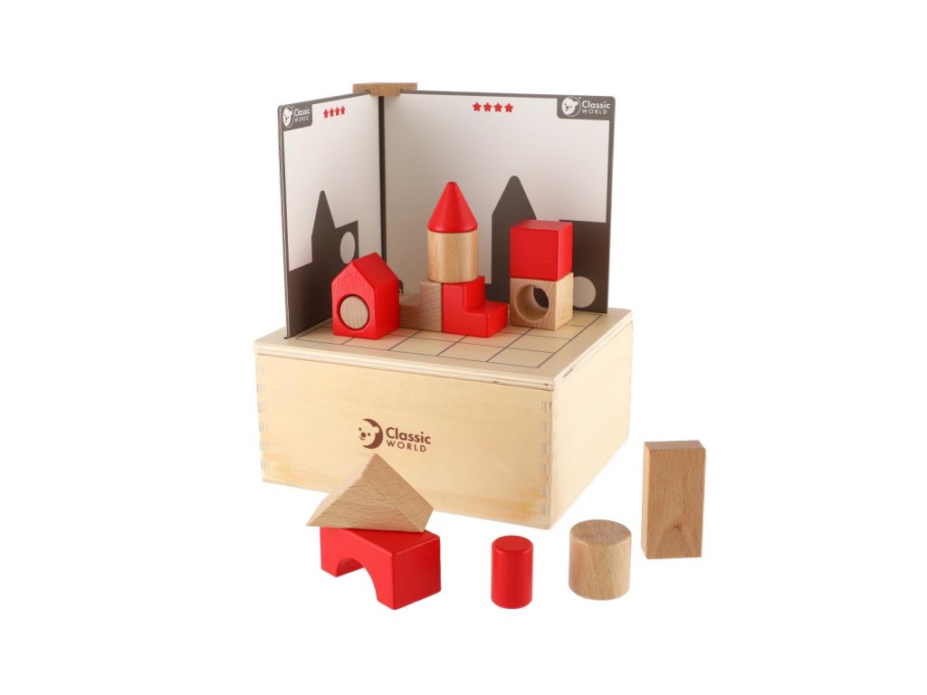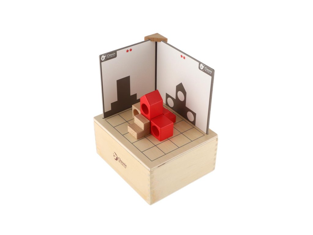 Tato sada bloků procvičí prostorovou orientaci dětí a schopnost logického myšlení. Sada využívá inspiraci ze světelné projekce. Děti pomocí svého prostorového myšlení sestaví blok podle kartičky a musí sladi obě strany. Karty jsou od jednoduchých až po obtížné úrovně. Balení obsahuje 41 dřevěných dílků a 14 karet.Rozměr dřevěné krabičky: 18,5 x 16 x 9 cm