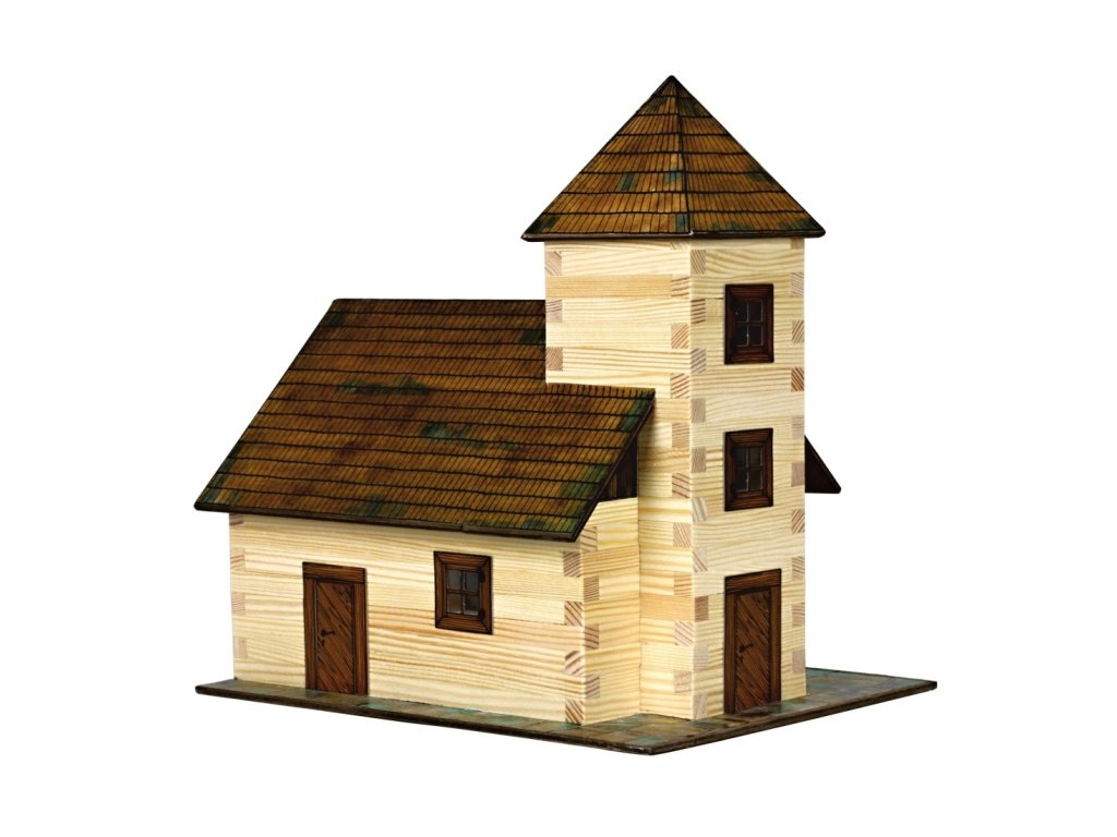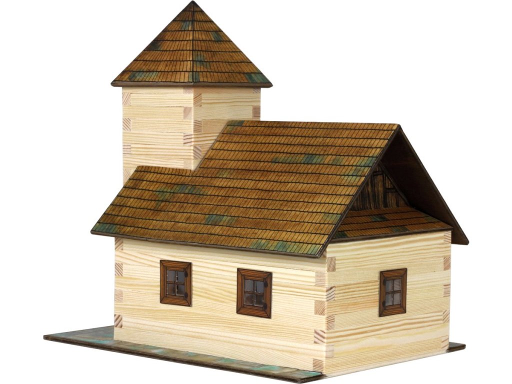 Dřevěná slepovací stavebnice obsahuje dřevěné hranolky daných délek ke stavbě roubených stěn, díly na střechy a štíty, kartonové výseky oken a dveří i předtištěné papírové potiskySoučástí stavebnice je schematický montážní plán