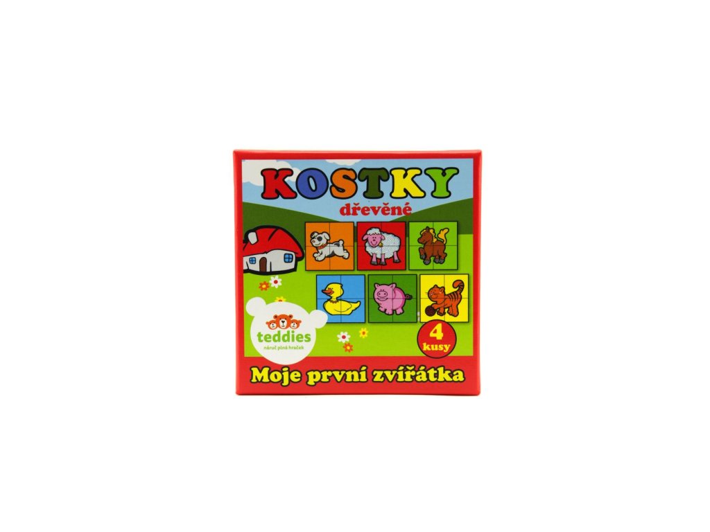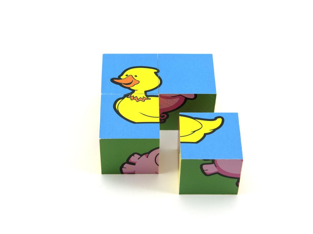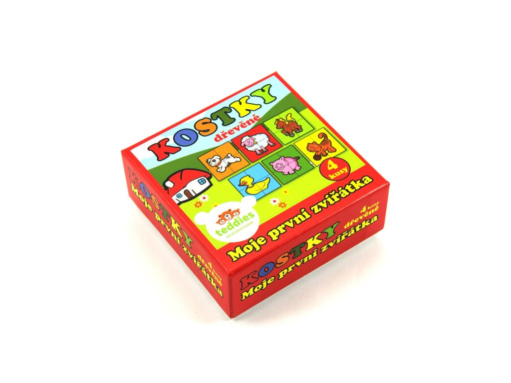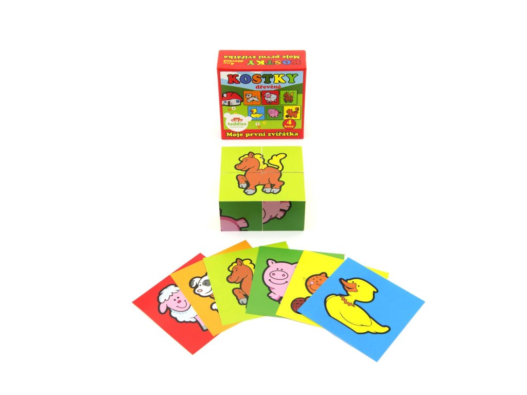 Čtyři dřevěné obrázkové kostky s motivem domácích zvířátek v papírové krabičce, z nichž je možné sestavit šest různých obrázků.Vhodné od 3 let.