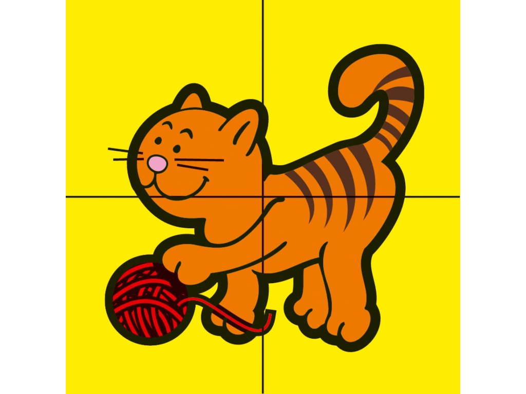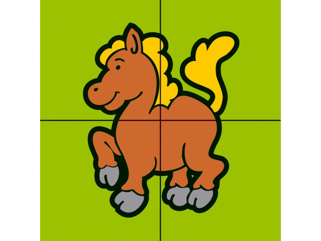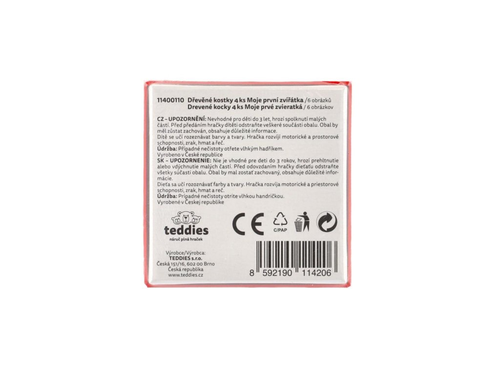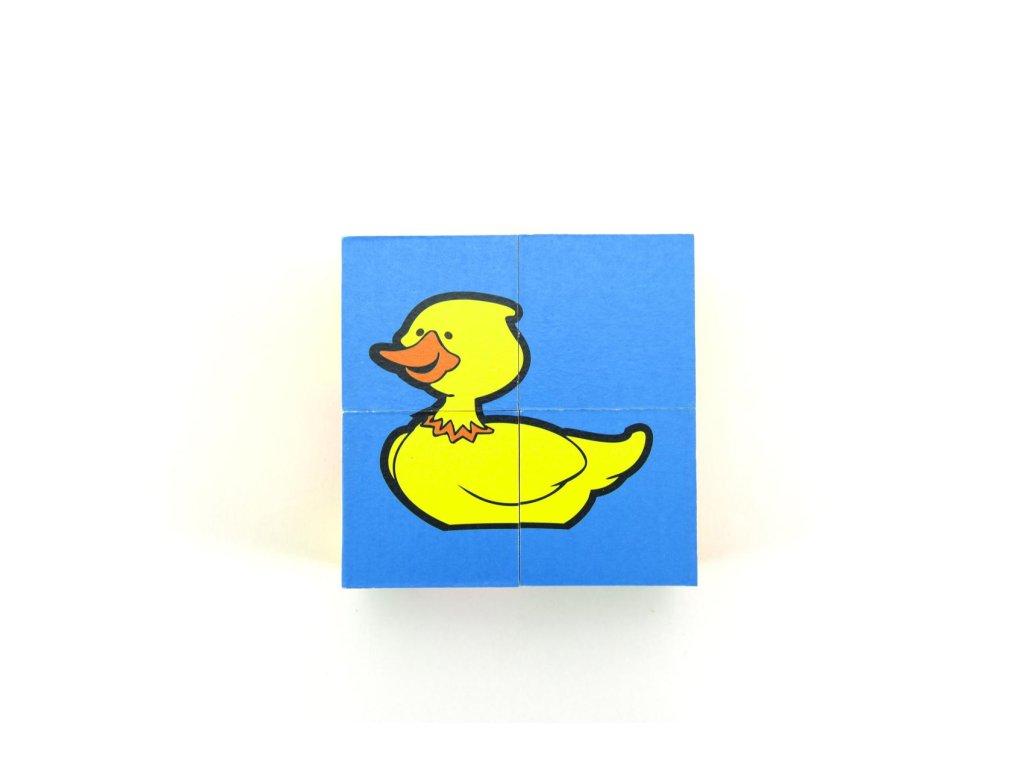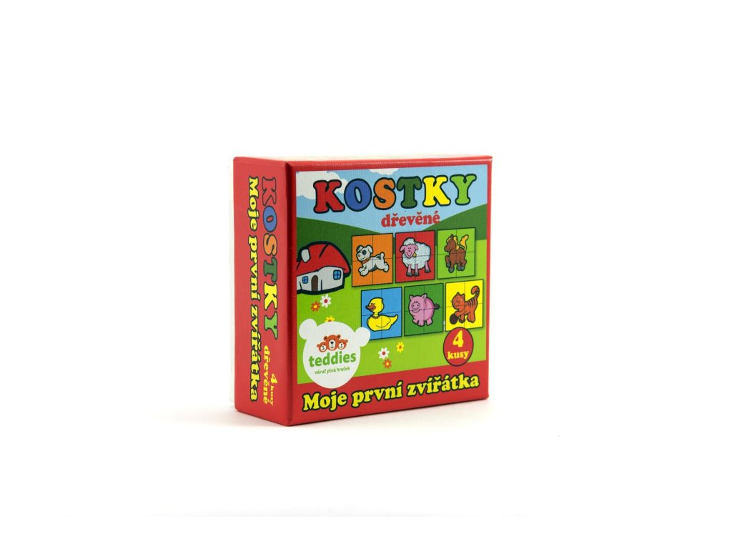 Čtyři dřevěné obrázkové kostky s motivem domácích zvířátek v papírové krabičce, z nichž je možné sestavit šest různých obrázků.Vhodné od 3 let.