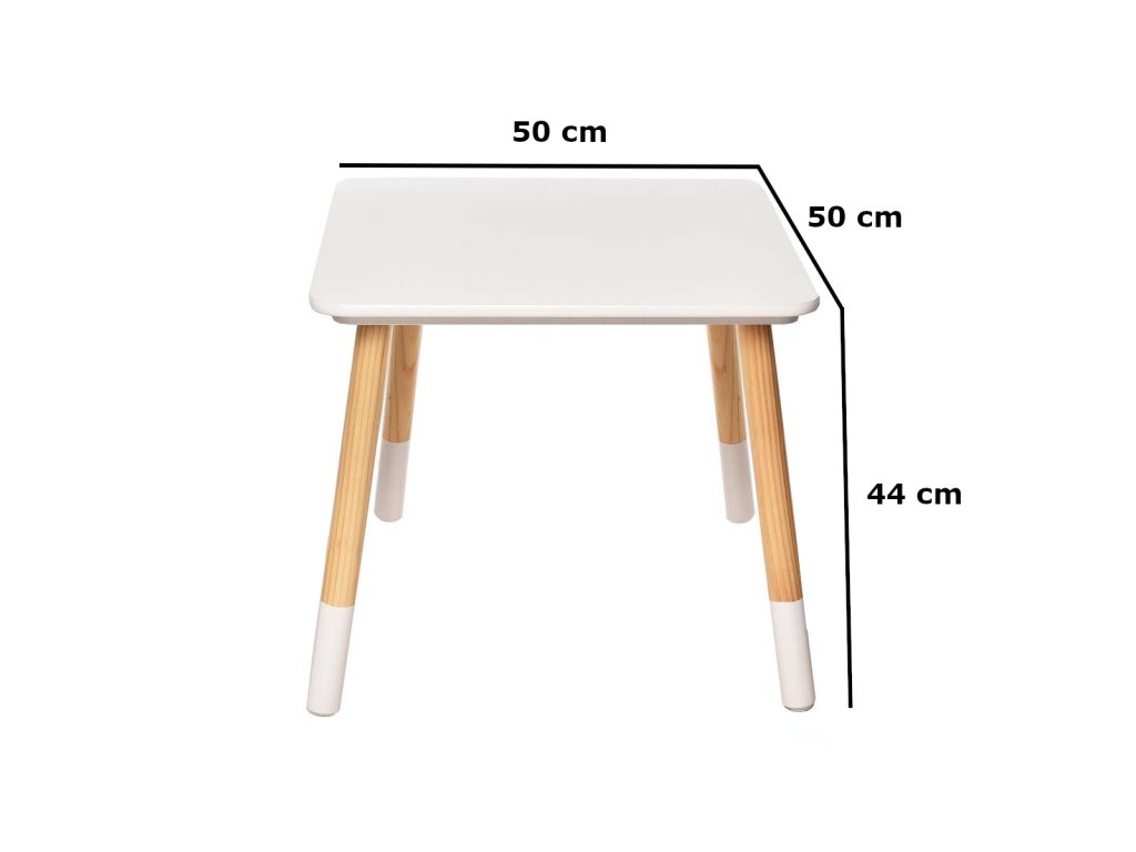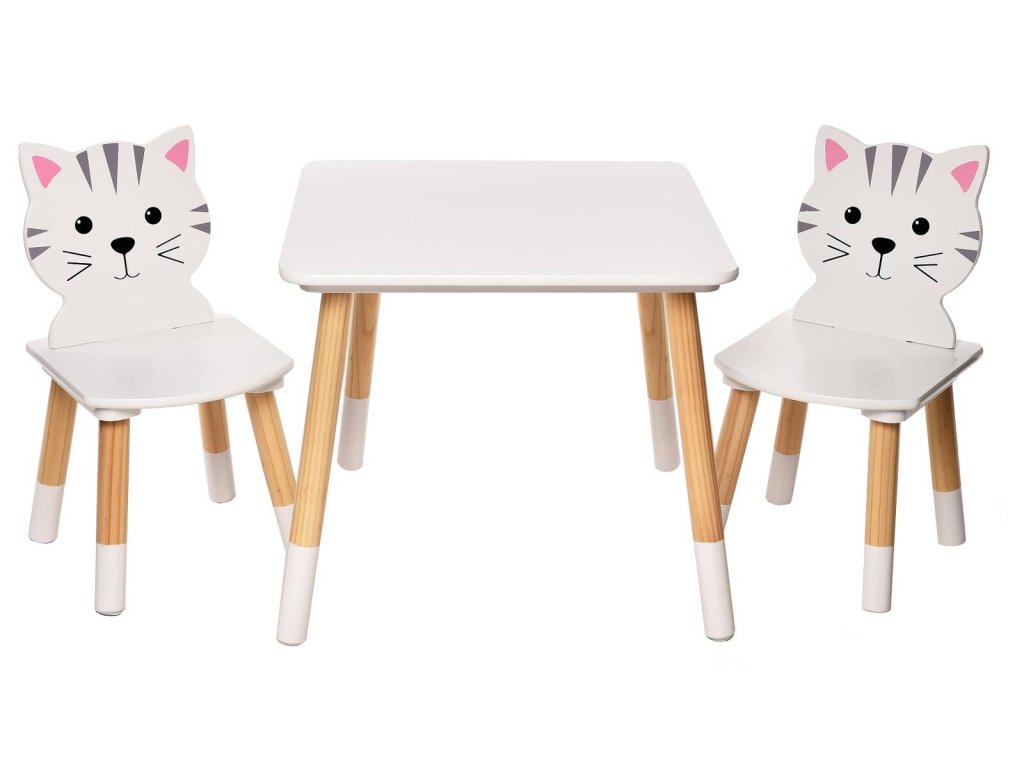 Nádherný dětský stůl v bílém provedení s židličkami s motivem kočiček. Stoleček je ideálním místem pro hraní, malování, občerstvení nebo pro posezení s kamarády. Originální doplněk do dětského pokoje, praktický, přizpůsobený dětským potřebám. Nábytek je stabilní, snadno se čistí. Vhodný pro děti od 2 let. Vlastnosti velmi silná a stabilní konstrukce snadno sestavitelná zaoblené rohy (větší bezpečnost dětí) max. nosnost stolu do 20 kg max. nosnost židličky do 25 kg Materiál MDF deska nohy z borového dřeva Rozměry stůl 50 x 50 x 44 cm židle 28 x 28 x 53 cmDoplňkové parametry