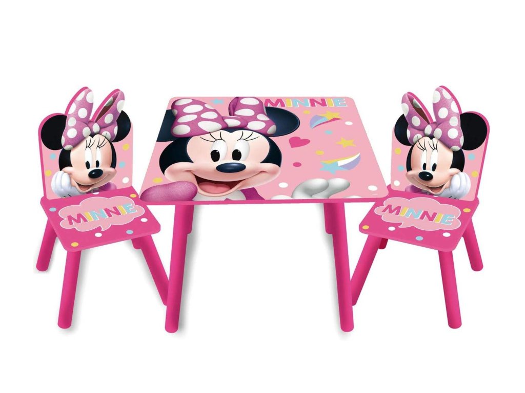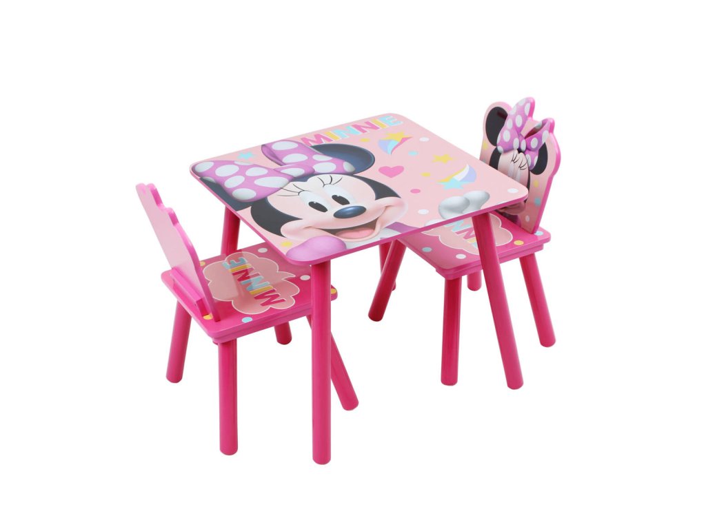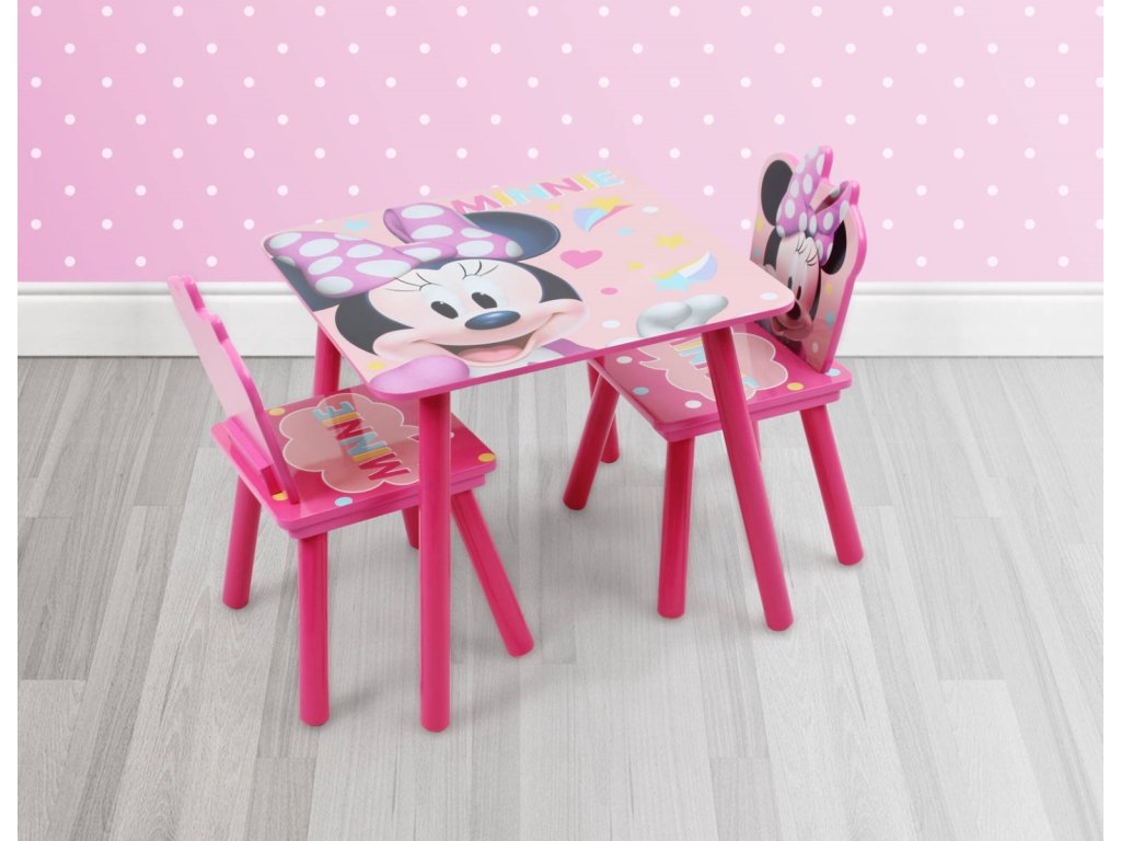 Dětský stůl s židlemi s roztomilou animovanou postavičkou Myškou Minnie z dílny Walt Disney potěší všechny děti. Barevný stůl s židlemi je nezbytnou součástí dětského pokojíčku. Známá kreslená postavička rozzáří každý pokojíček a zároveň vytvoří místo na hraní, kreslení, relaxaci. Vhodný pro děti od 3 let. Vlastnosti velmi silná a stabilní konstrukce snadno sestavitelná zaoblené rohy (větší bezpečnost dětí) max. nosnost stolu do 20 kg max. nosnost židličky do 50 kg Materiál kvalitní MDF deska Rozměry stůl 50 x 50 x 43,5 cm židle 27 x 27 x 48 cmDoplňkové parametry