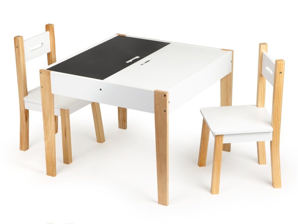 Set obsahuje stůl a dvě židličky s pevnými nohami z borovicového dřeva a odnímatelnou dvojitou deskou stolu.
