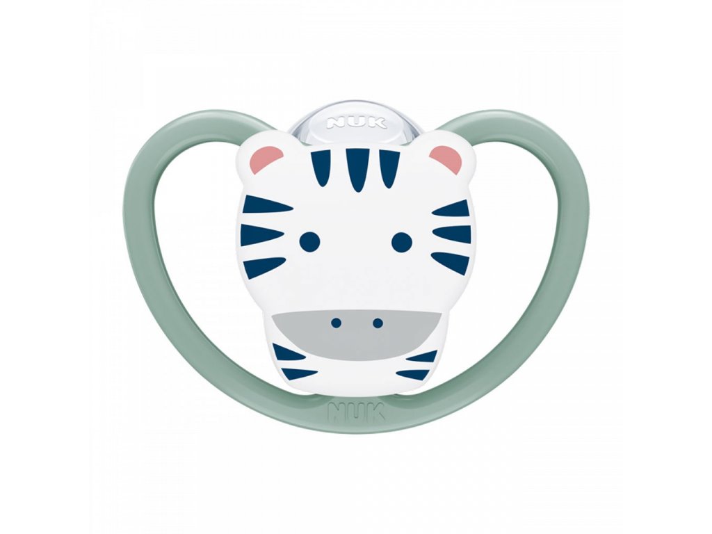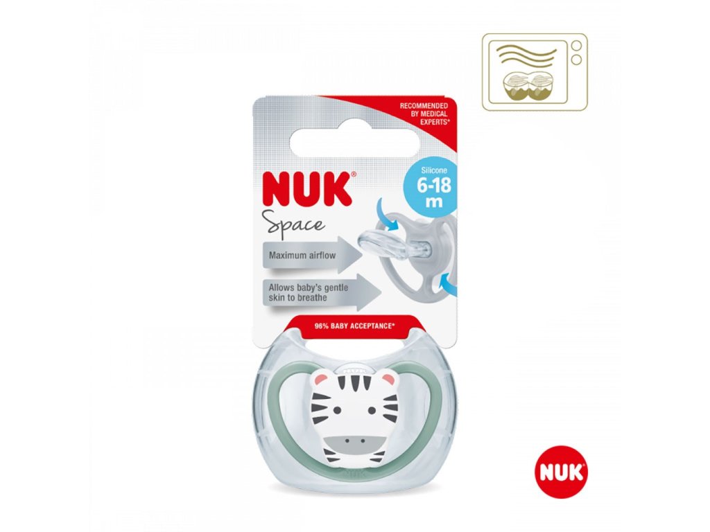 Kojenecký silikonový dudlík NUK Space 1/box 6-18 měsíců s krásným barevným obrázkem zvířátka. Nový dudlík Space s inovativním, moderním designem umožňuje jemné dětské pokožce dýchat. Speciálně určen pro citlivou pokožku dítěte a má robustní, znovu použitelný box pro uskladnění, přepravu a hygienickou sterilizaci v mikrovlnné troubě. Dudlík je vyroben z vysoce kvalitního plastu a silikonového dudlíku. Výhodou silikonu je to, že je bez zápachu a lehce se čistí. Neobsahuje BPA. Všechny NUK dudlíky jsou pravidelně testovány a sledovány nezávislými instituty.Doplňkové parametry
