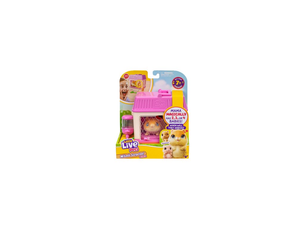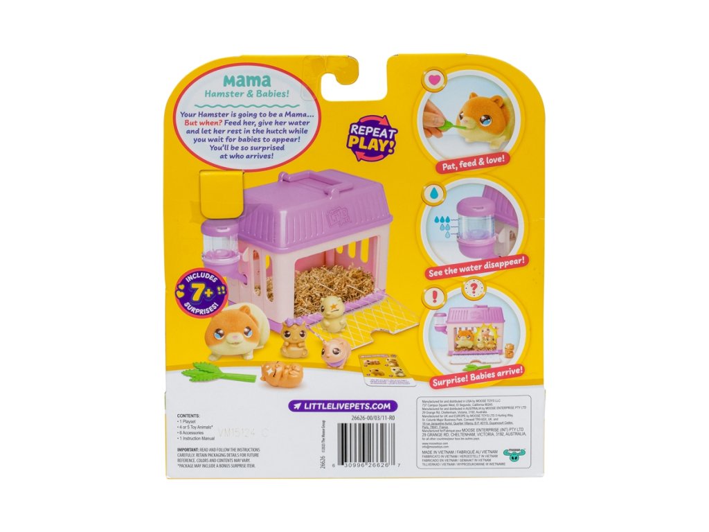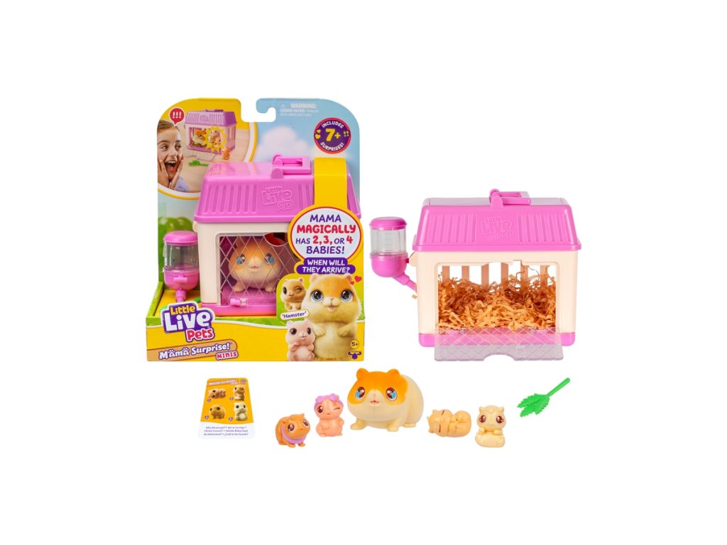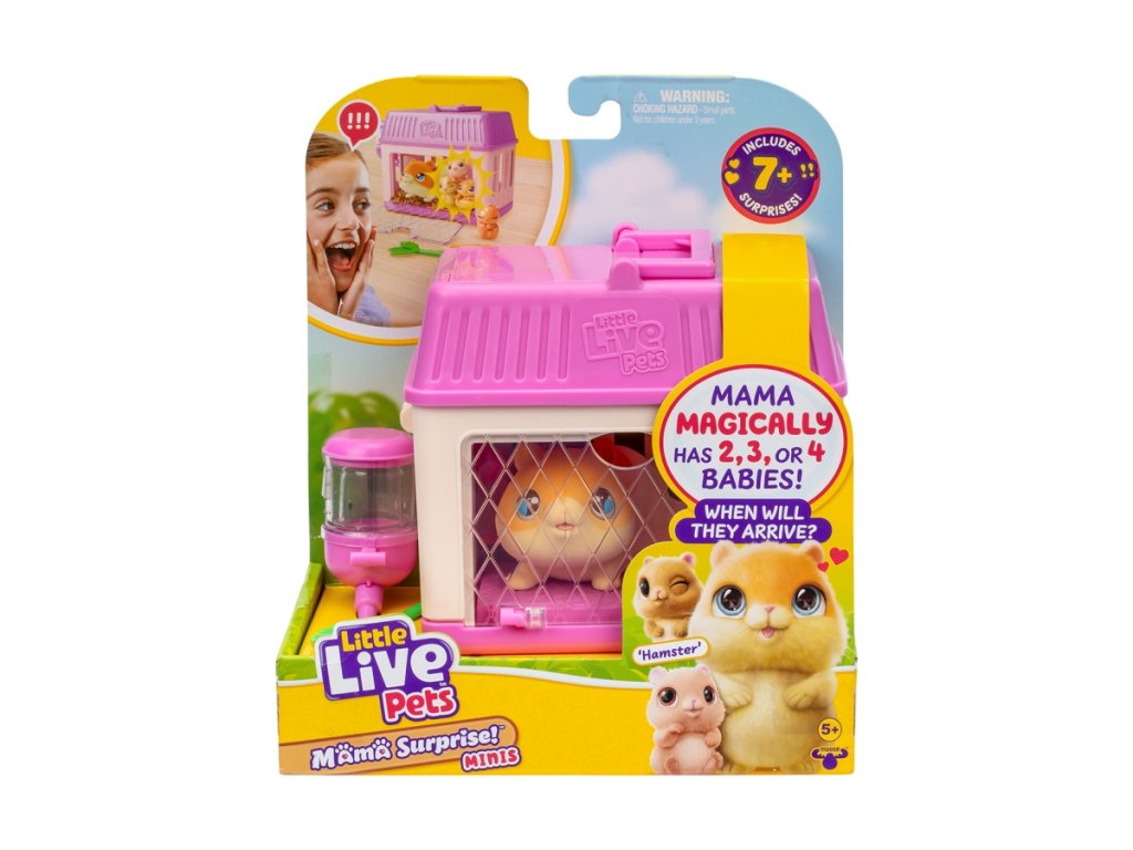 Tuto sadu vytvořila značka Moose. Pochází ze série Little Live Pets, která představuje realistické zvířecí hračky.Tento rozkošný plyšový křeček od Little Live Pets skrývá více než jedno sladké tajemství! Pokaždé, když vaše ratolesti sáhnou po křečku Mini Mama, mohou objevit 2, 3 nebo 4 malé křečky – náhodný počet miminek činí každou hru jedinečnou a vzrušující. Křeček Mini Mama přichází s vlastním útulným domečkem a sadou doplňků, které usnadňují péči o křečkovou rodinu. Hraní s křečkem Mini Mama rozvíjí u dětí empatii, schopnost být zodpovědný a pečovat o druhé. Péče o křeččí rodinu – krmení miminek, úklid domu a péče o jejich pohodlí – je skvělým tréninkem pro mladé ošetřovatele zvířat. Doporučený věk 5+Doplňkové parametry