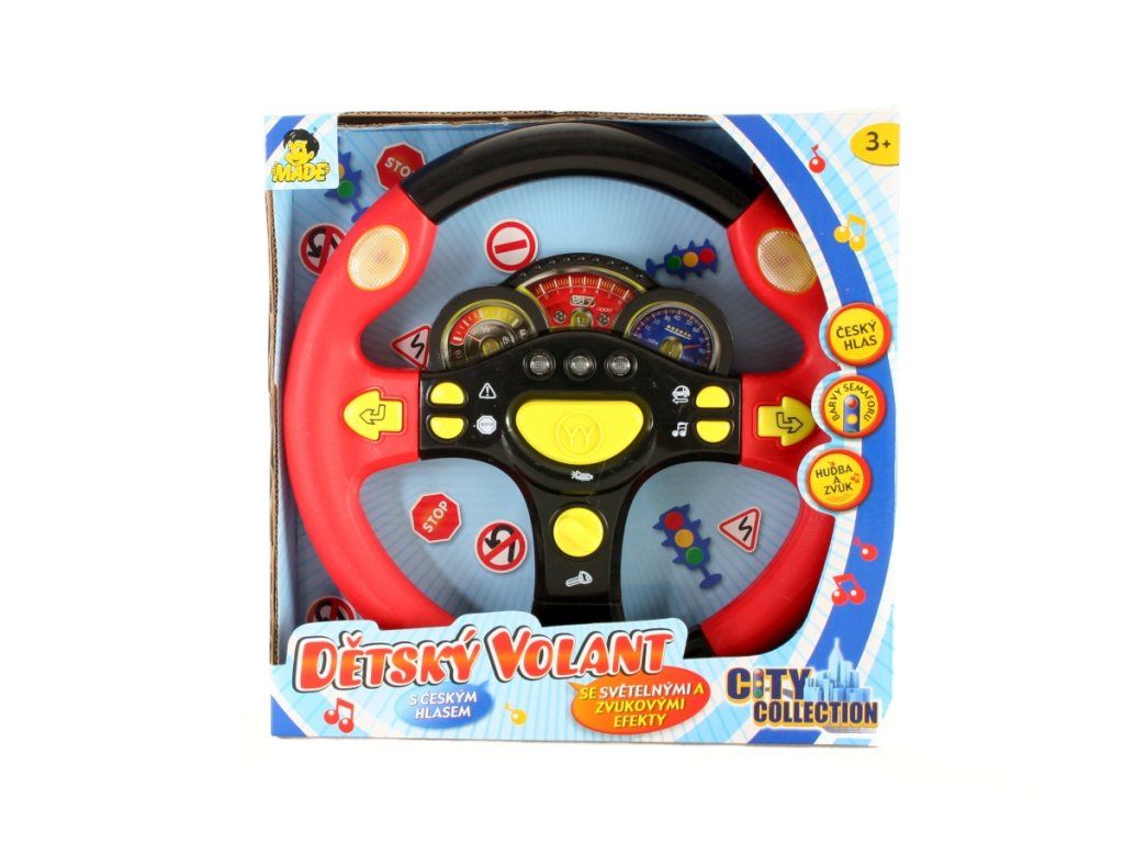 Volant o velikosti cca 24 cm se světelnými a zvukovými efekty - klakson,startování,blikání a zvuk směrového světla,hudba,zvuky brzd,Dětský volant s českým hlasem.Provoz na 3 baterie AA.Věk 3+Doplňkové parametry