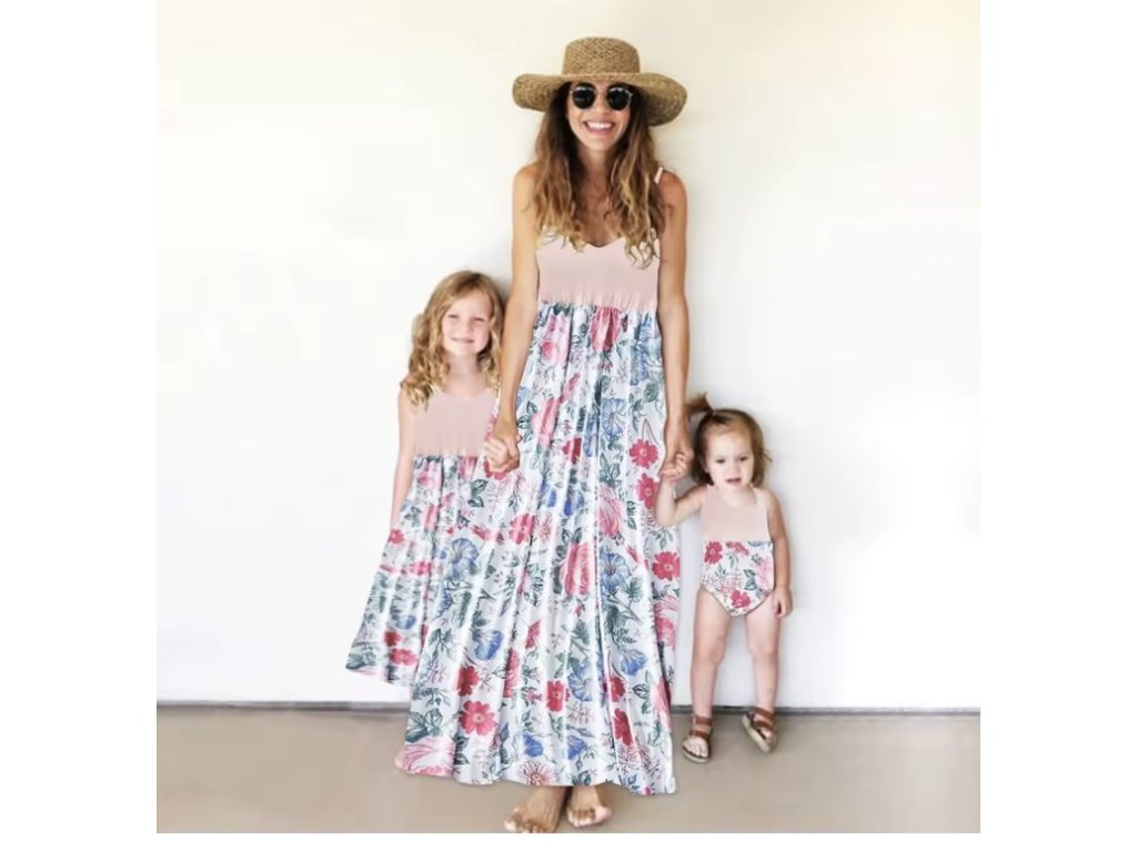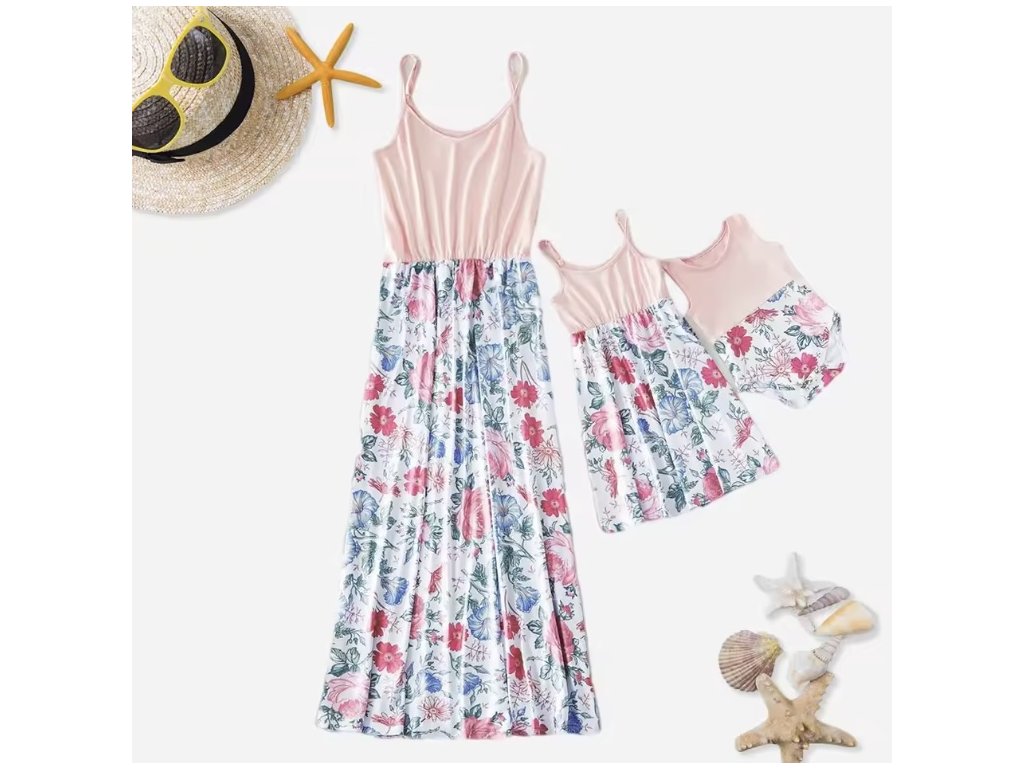 Letní květované růžovo-bílé dlouhé šaty bez rukávů pro maminku a dceru (SKLAD)
