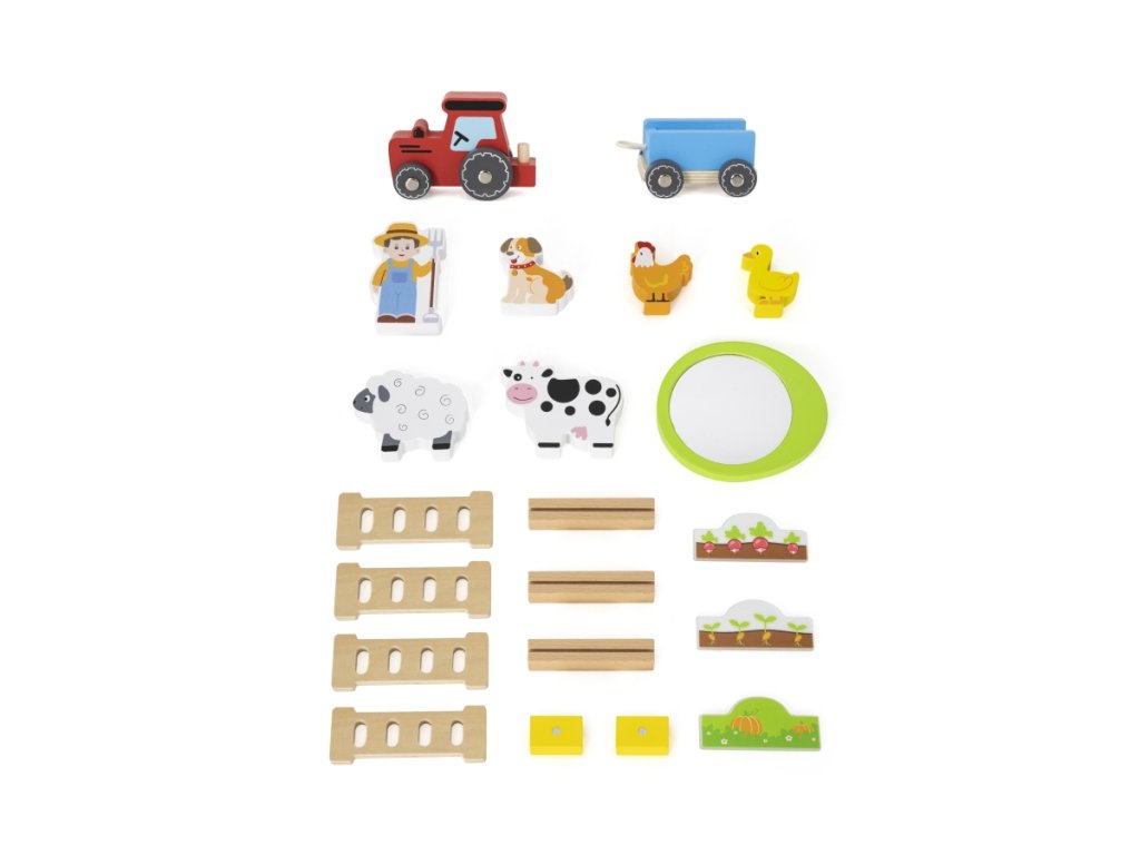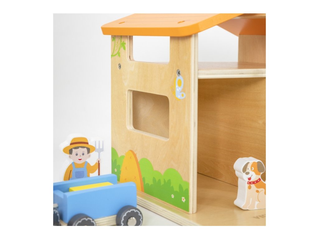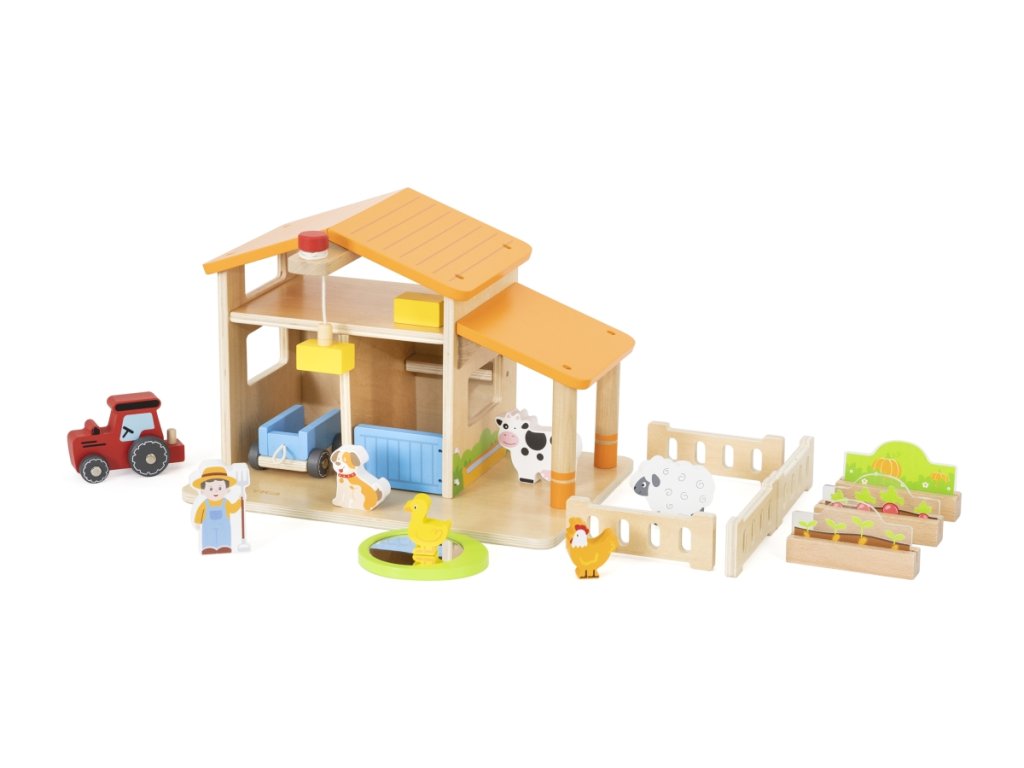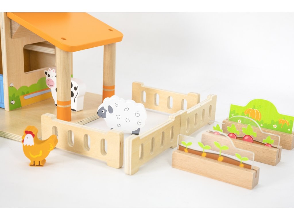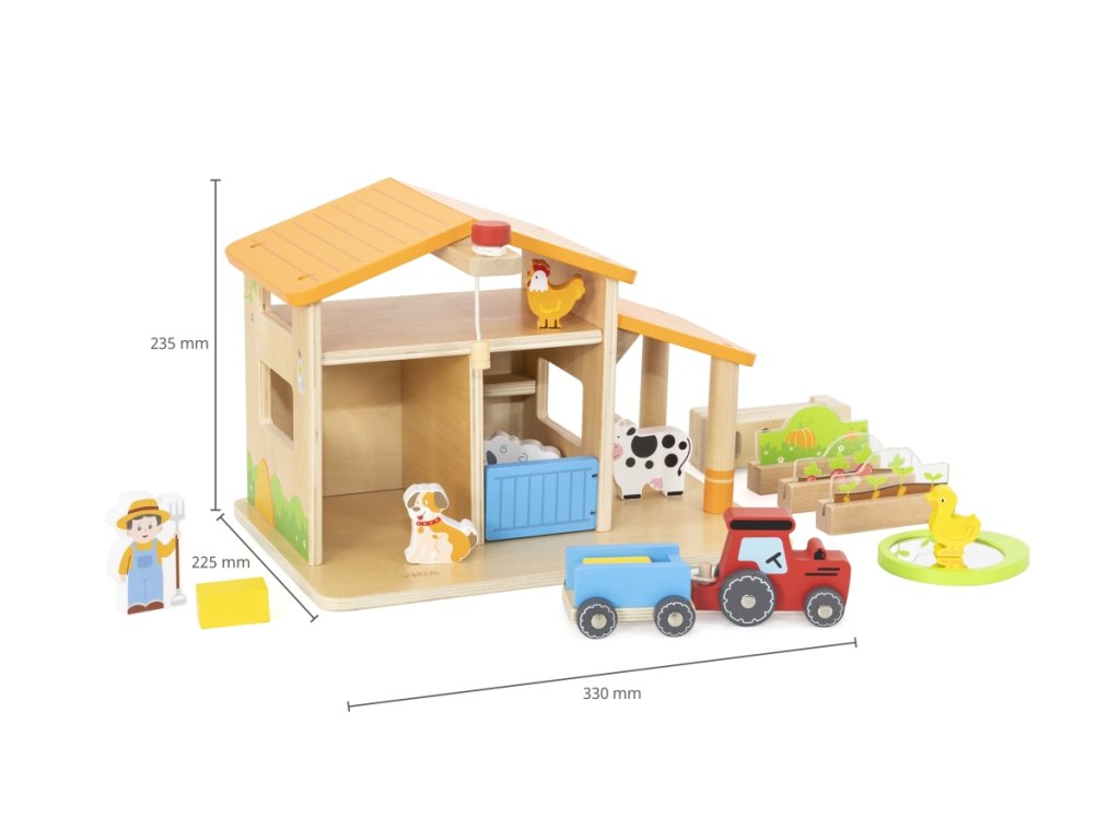 Dřevěná farma s příslušenstvím. Rozměry 33x22,5x23,5 cm. Rozměry balení 35x32x24 cm. Součástí drobné doplňky jako např. farmář, zvířata nebo ohrada. Věk 3+Doplňkové parametry