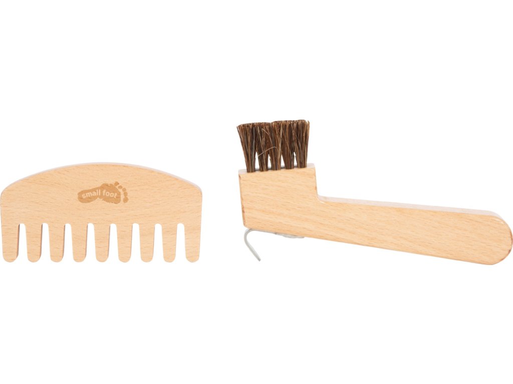 Taška s příslušenstvím na čištění a péči o koně. Je vhodná pro všechny děti, které mají rády koníky. Taška je odolná, praktická a dostatečně prostorná, aby pojala veškeré vybavení. Péče o koně je součástí každodenní rutiny každého fanouška koní a koníci kartáčování milují. Taška s doplňky je vyrobená z vysoce kvalitních materiálů a máte vše, co potřebujete, hned po ruce, i když jste na cestách. Mezi doplňky patří kartáč, hřeben, škrabka na kopyta a hřeben na hřívu, to vše se vejde do prostorného vnitřku tašky a do malé boční kapsy. A samozřejmě nechybí dřevěné jablko a mrkev. Sada se dodává s turnajovou stuhou, kterou si děti mohou připevnit na obojek hlavy svého koníka nebo na vlastní oblečení.