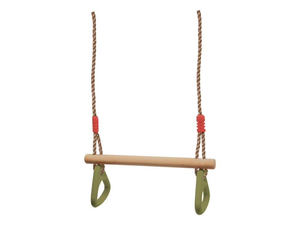 S víceúčelovou houpačkou se mohou děti nejen houpat, ale i posilovat rovnováhu, sílu a obratnostNa robustní dřevěné tyči mohou sedět, nebo se za ni držet a využívat ji jako hrazdu