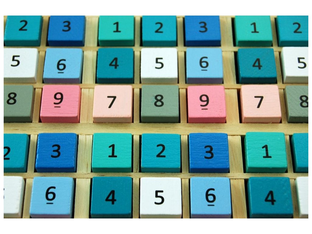 Dřevěné dílky jsou umístěny v devíti polích na dřevěné desce. Dílky mají čísla od 1 - 9 a děti musí vymyslet, aby čísla dobře pasovala k sobě.