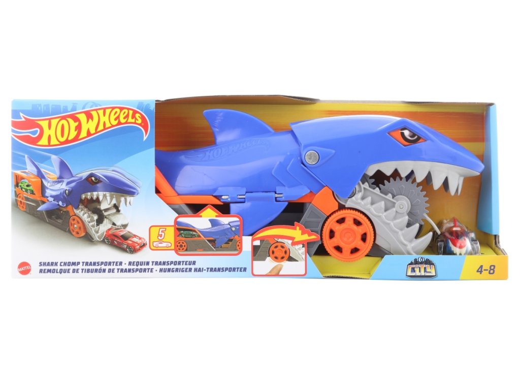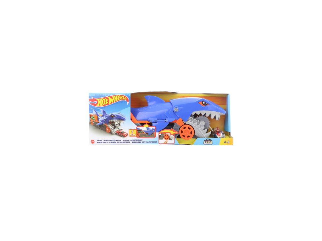 Hrací set žraločího náklaďáku Hot Wheels® Shark Chomp Transport přetváří ikonické auto Shark Bite ™ Hot Wheels® na skvělý nový tahač. Díky speciálnímu kousacímu mechanismu, který se aktivuje, když na něj děti tlačí, popadne žralok auto přímo do čelistí a uloží si ho do břicha. Potřebujete vyložit? V zadní části je výjezdová rampa pro snadný přístup. Přepravní vozidlo Hot Wheels® Shark Chomp je dodáváno s jedním autem Hot Wheels® v měřítku 1:64 a pojme až čtyři další (prodávají se samostatně)! Děti od čtyř let si zamilují ukusování z úklidu! Barvy a dekorace se mohou lišit.Doplňkové parametry