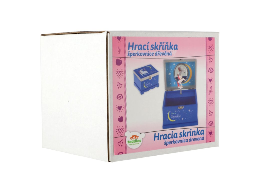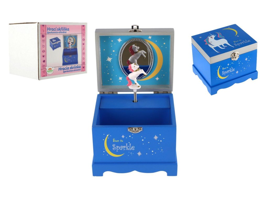Skříňka šperkovnice jednorožec hrající na natažení dřevo odklápěcí vrch modrá 12,5x10,5cm v krabičce