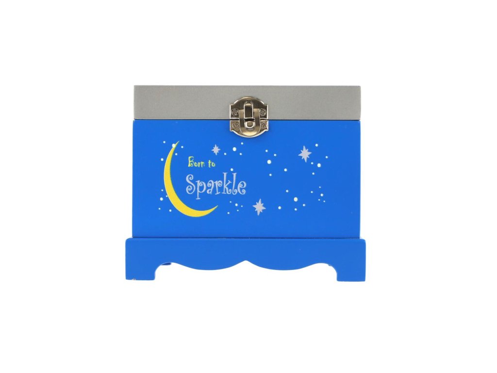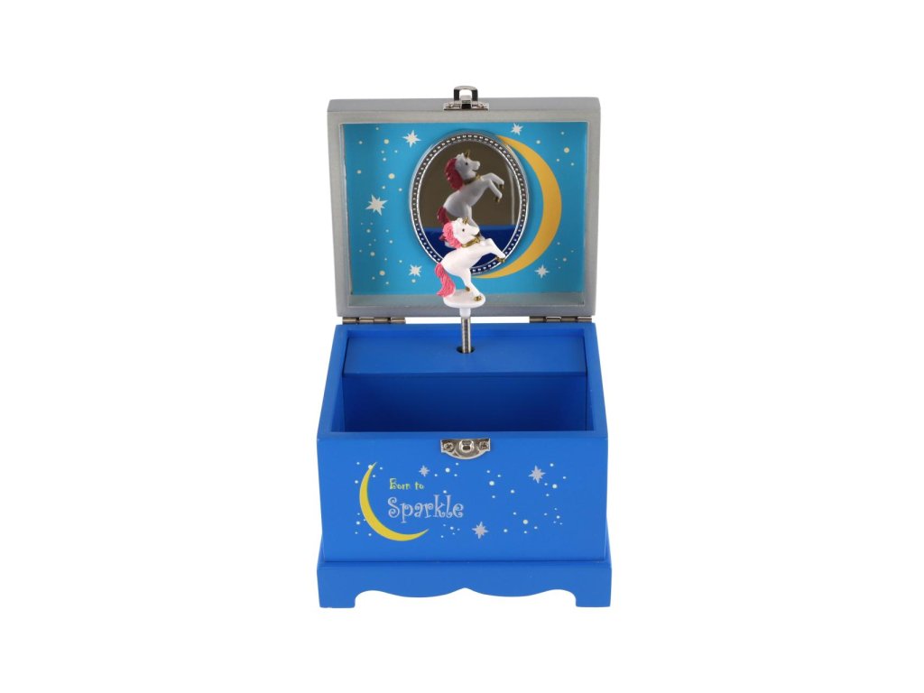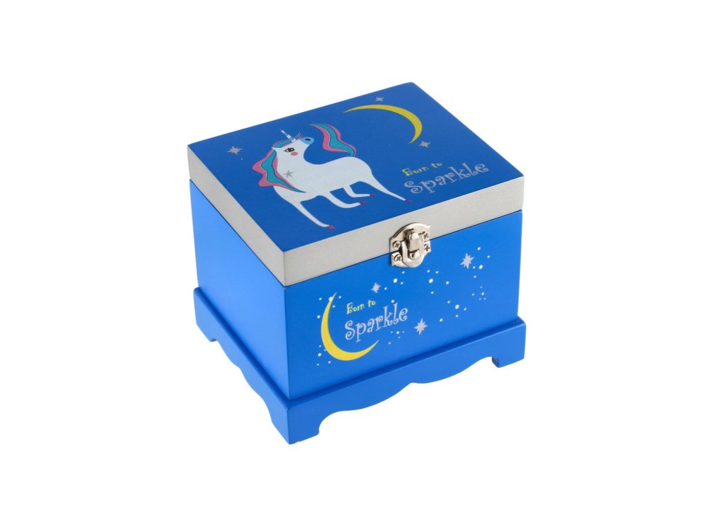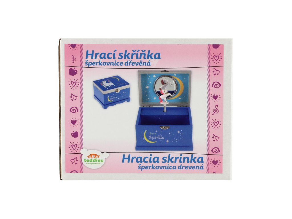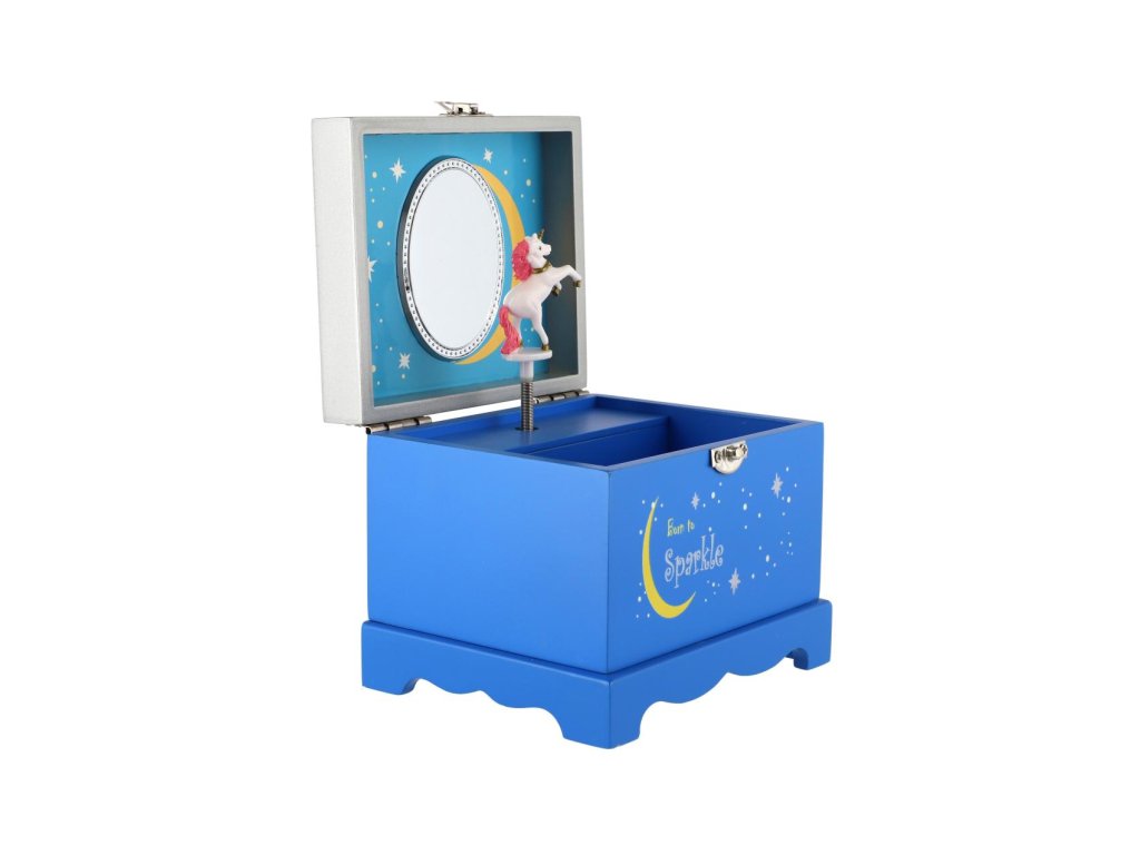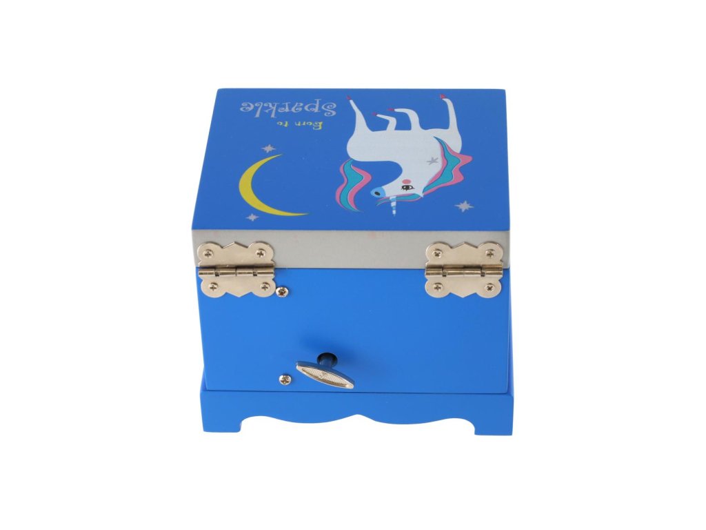 Tato hrací šperkovnice bude ideálním místem pro uložení pokladů každé dívky. Šperkovnice je vyrobena ze dřeva, má krásnou modrou barvu a je zdobena hvězdami a motivem jednorožce, což z ní dělá ideální doplněk pro dětský pokoj. Pod krytem se zrcadlem je prostor pro pořádání suvenýrů nebo šperků. Také zde je bílo-růžový jednorožec, který se po natažení klíčku točí a hraje.Rozměr šperkovnice: 12,5x12,5x10cm