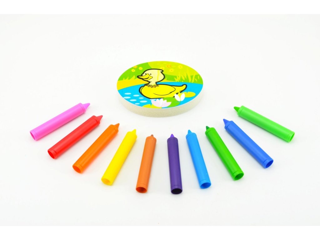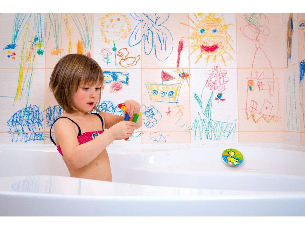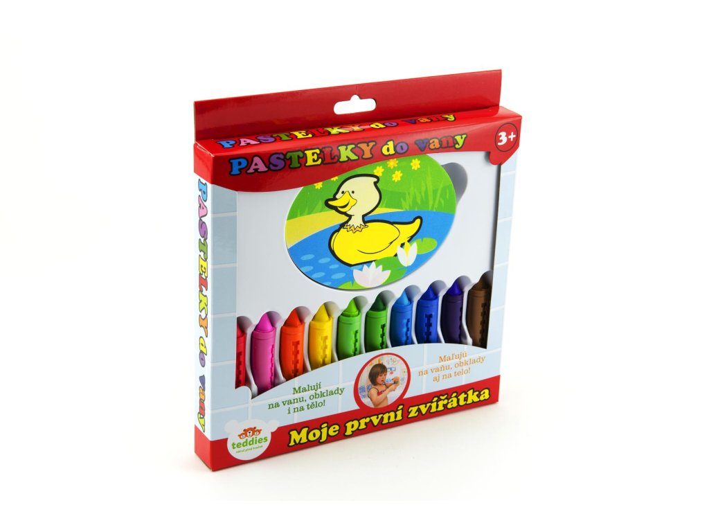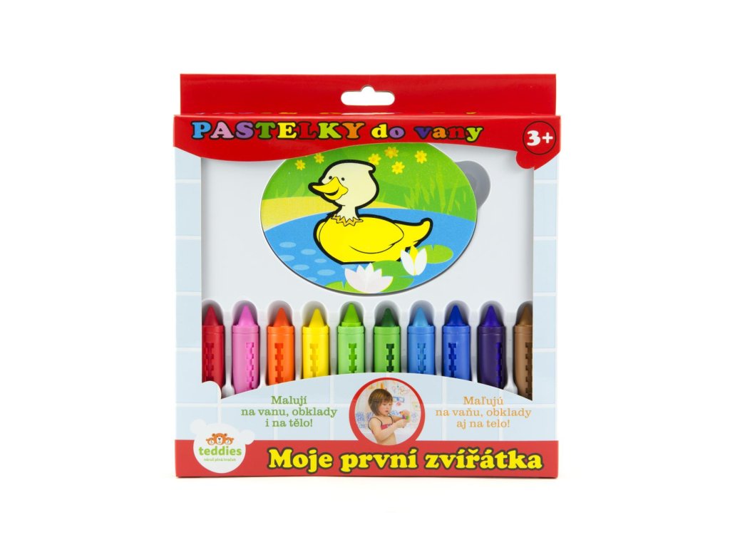 S pastelkami do vany Moje první zvířátka se vaše koupelna promění každý den v jiný svět. Malují na vanu i obklady a děti si s nimi užijí moře legrace. Mohou vytvořit hotová umělecká díla a maminky se nemusí obávat, protože tyto pastelky jdou lehce smýt. Jsou zcela bezpečné, netoxické a hypoalergenní.Sada obsahuje 10 pastelek a houbičku s motivem kačenky