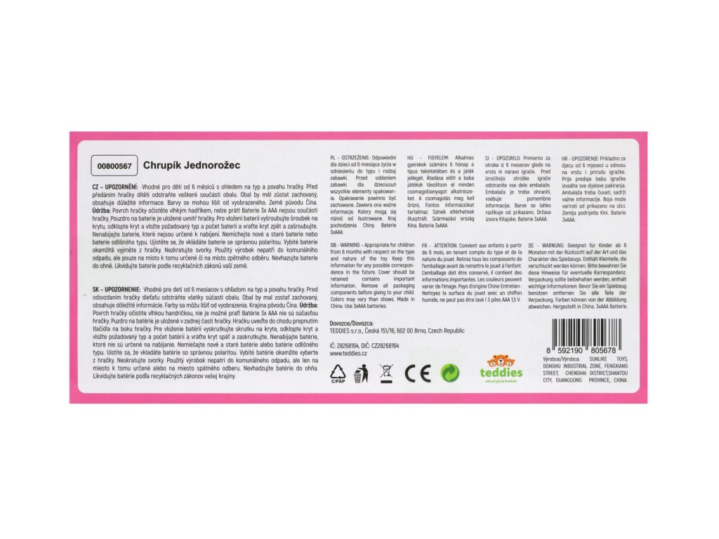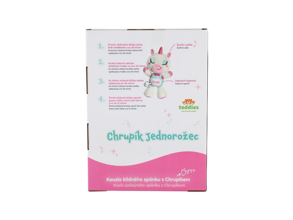 Jednorožec Chrupík – kouzelný usínáček se světlem a zvuky pro klidné večery.Usínání bude odteď pro děti kouzelným zážitkem. Roztomilý Jednorožec Chrupík kombinuje mazlivého plyšového kamaráda s uklidňujícím světlem a zvuky. Je ideálním společníkem pro večerní rituály a první samostatné usínání. Jednorožec je vyroben z hebkého plyše a má plastový panel se světelnými a zvukovými efekty. Po stisknutí tlačítka zahraje jemnou melodii, která uklidní dítě a podbarví příjemnou atmosféru tlumeným světýlkem. Díky napájení na baterie lze hračku snadno používat kdekoliv – v postýlce, kočárku i na cestách.