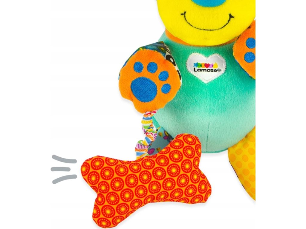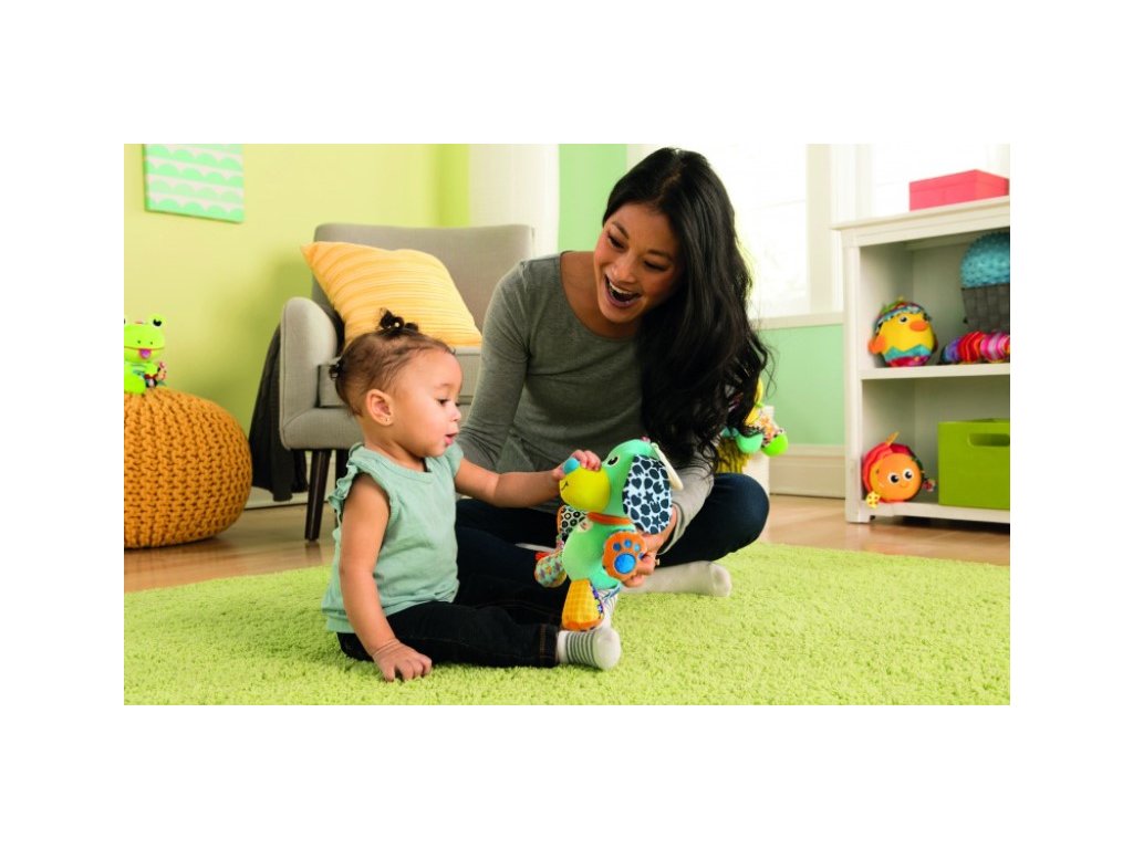 Štěkjaící štěně.Štěkající štěně je vyrobeno z různě strukturovaných a barevných materiálů, které stimulují zrak, hmat a rozvíjí motoriku. Po zatřesení vydává hračka zvuky důležité pro rozvoj sluchu. Kostička a ouška po zmáčknutí zašustí. Po stisknutí čumáčku se ozvou štěněčí zvuky. Charakteristický tvar očí upoutává dětskou pozornost a podporuje rozvoj koncentrace.