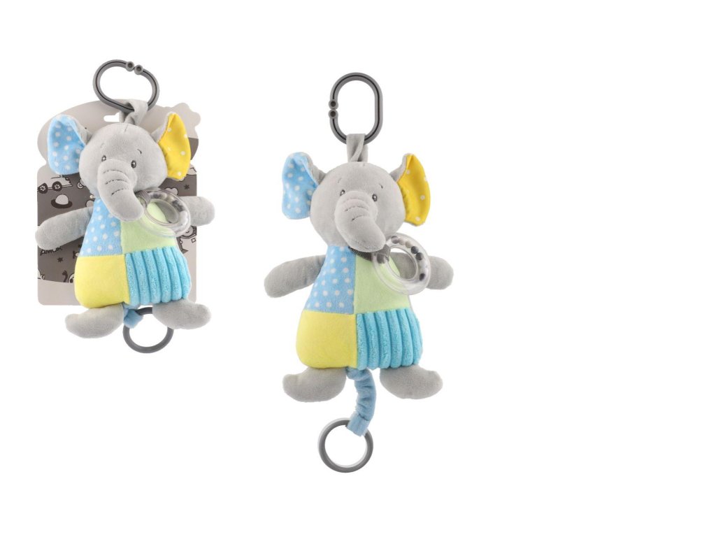 Hrací strojek se zvířátkem zaručeně upoutá pozornost Vašich malých dětí díky uklidňující melodii, kterou vydává. Délka melodie po natažení cca 1 minuta. Plyšová hračka má také chrastítko.Rozměr slona: 15 x 21 cm