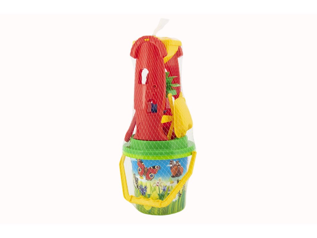 Sada na písek plast kbelík, mlýnek s doplňky 4 barvy v síťce 20x42x19cm 12m+