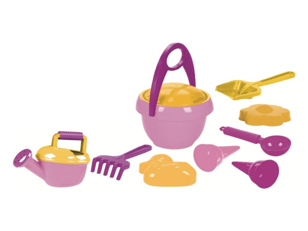Sada na písek pro holky, která obsahuje kyblík, sítko, konev a ladší doplňky. 10 ks.Rozměr 25x27x15 cm.