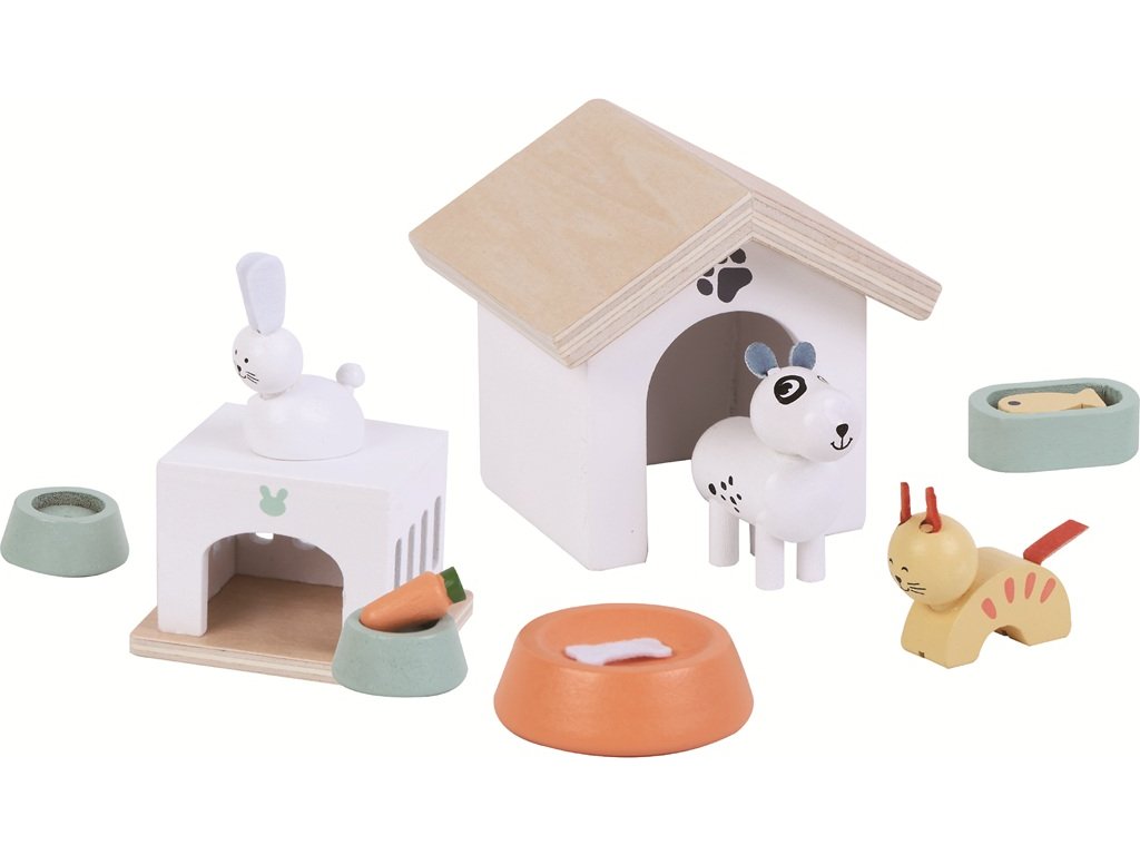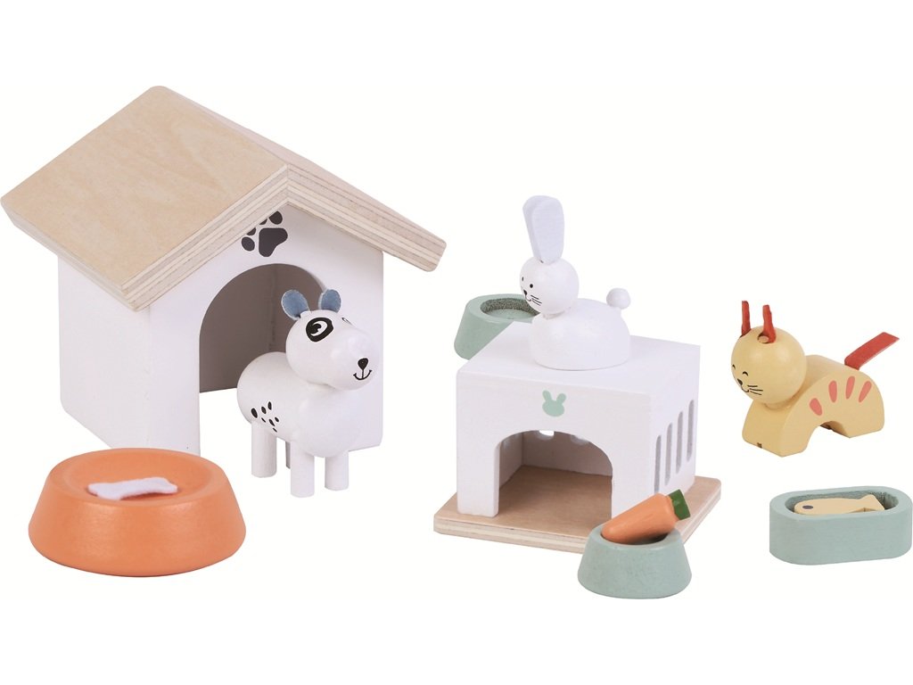 Pejsek má boudu, králíček domeček, kočka… no, ta si může sednout třeba na střechu. Ale misku má každý svou. Copak si asi dá kočička? Zdravou mrkvičku? Zábavná sada je ideální pro malé chovatele, kteří chtějí zvířátkům zařídit útulný domov a dát jim plnou misku. Děti si při hře rozvíjejí představivost, učí se péči o zvířata a vytvářejí vlastní příběhy.