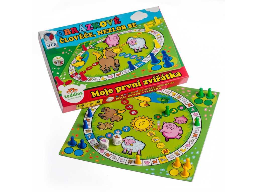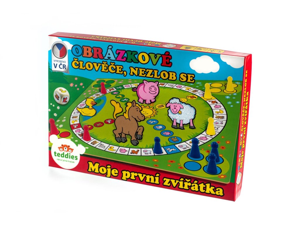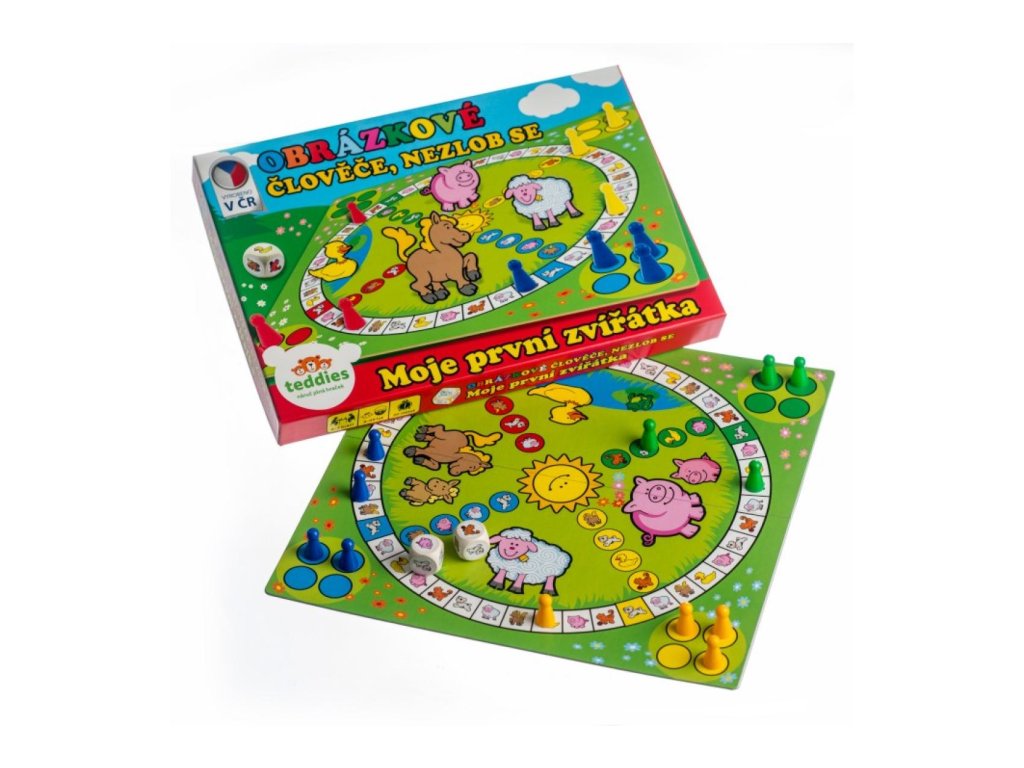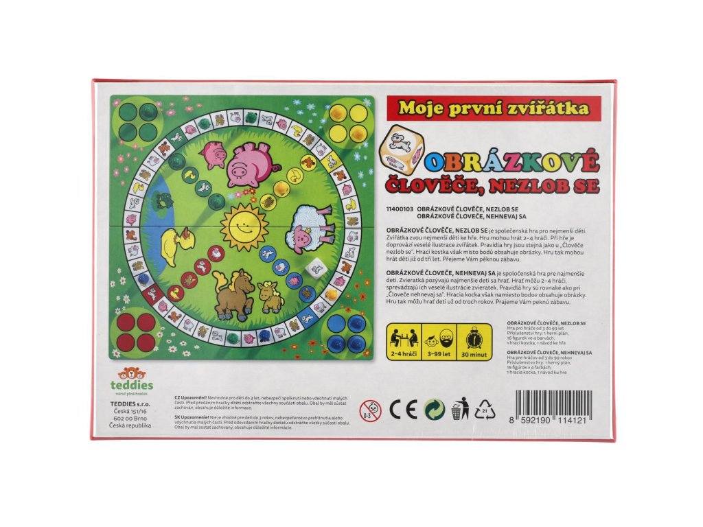 Obrázková verze hry Člověče nezlob se, kterou zvládnou i ti nejmenší. Místo čísel jsou na hrací kostce vyobrazeny motivy zvířátek, podle kterých hráči postupují po herním plánu. Hru tak snadno pochopí i malé děti a díky veselým obrázkům se nejen baví, ale i učí.Balení obsahuje: herní plán, 16 figurek ve 4 barvách, hrací kostku s obrázky a návod.