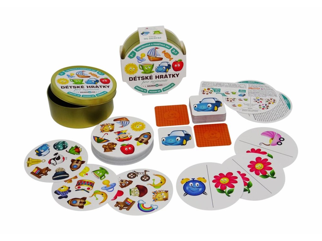 Zábavná karetní postřehová hra balená v malé plechové krabičce. To jsou Dětské hrátky, které obsahují tři zábavné karetní hry: Hmaťáka, Domino a Pexeso. Děti si zábavnou formou zlepšují postřeh a paměť. Jednoduchá pravidla a krásně malované obrázky.Rozměry výrobku 10 x 10 x 4 cm.
